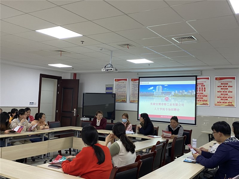 4月26日下午,应人文学院邀请,芜湖安博帝特工业有限公司到人文学院进行专场招聘宣讲和现场面试,会议在图书馆1415举行。