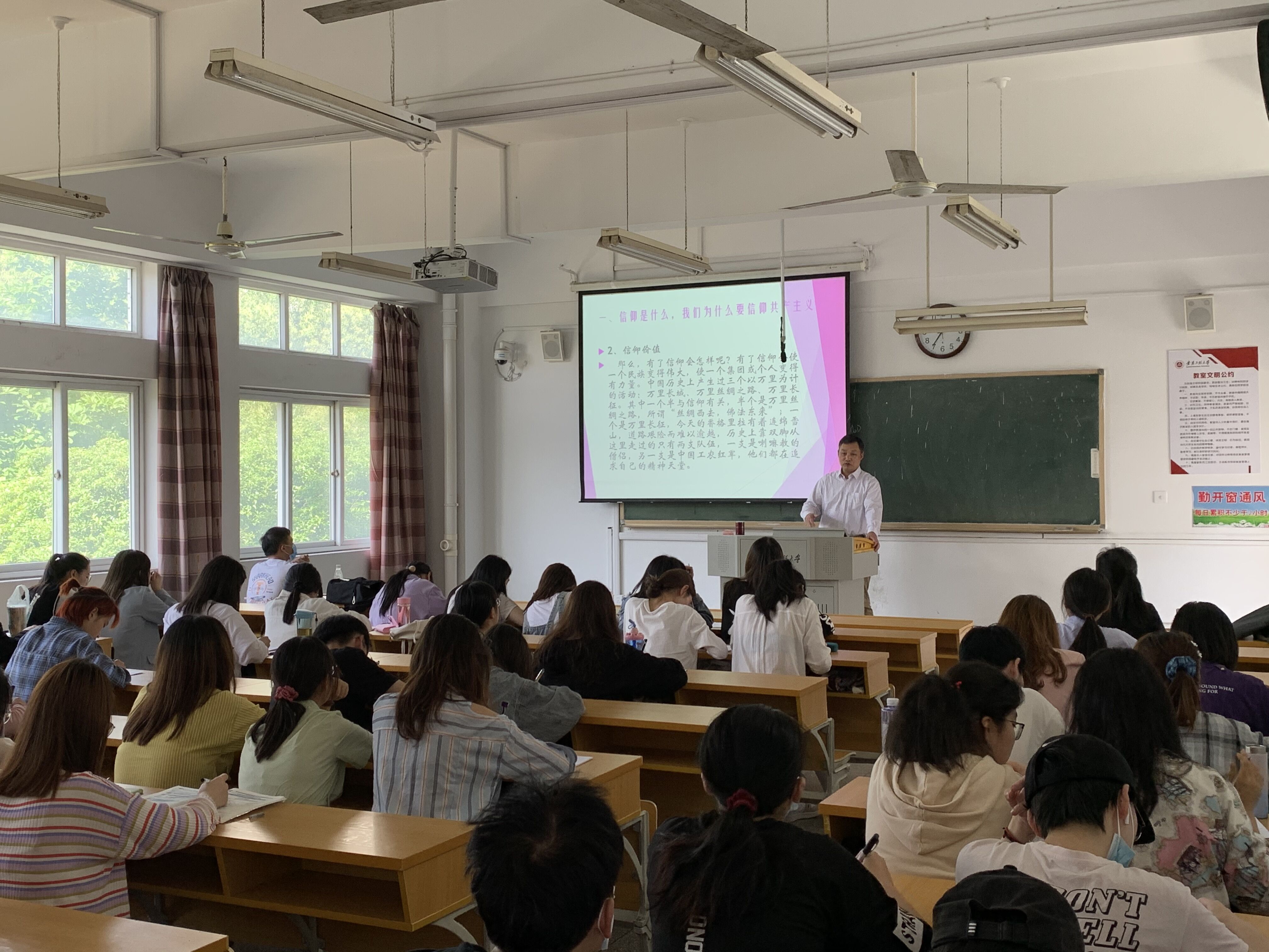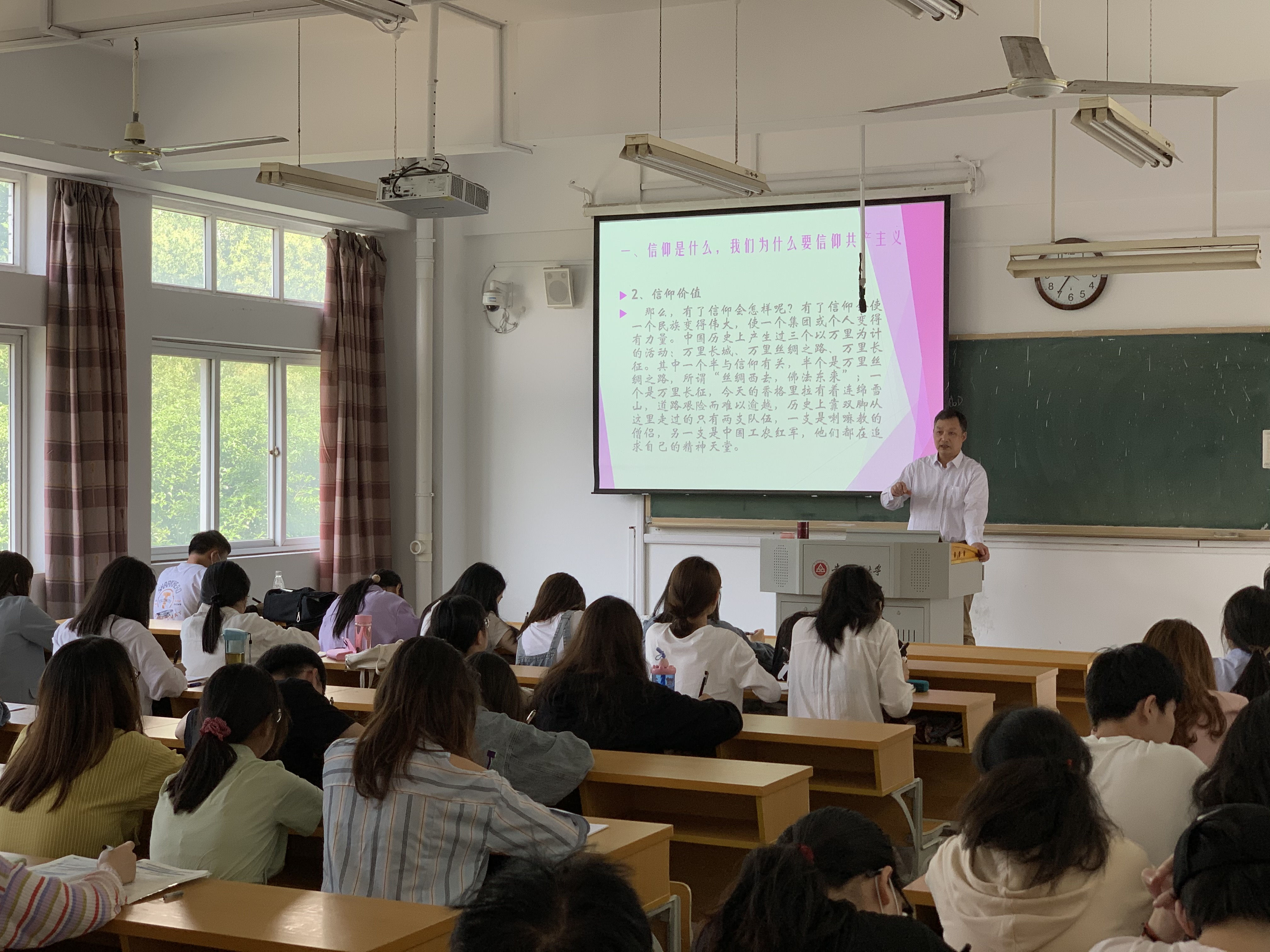 邓英扣从信仰是什么,我们为什么要信仰共产主义、当代青年应有怎样的信仰——共产主义信仰、不忘初心牢记使命等三个部分阐述了共产主义信仰的必要性和坚定性,勉励青年大学生听党话、跟党走,勇敢肩负起青年的光荣传统和使命,撸起袖子加油干,争做新时代新青年,并告诉同学们习近平总书记对广大青年提出的殷切希望:一定要坚定理想信念、一定要练就过硬本领、一定要勇于创新创造、一定要矢志艰苦奋斗、一定要锤炼高尚品格。