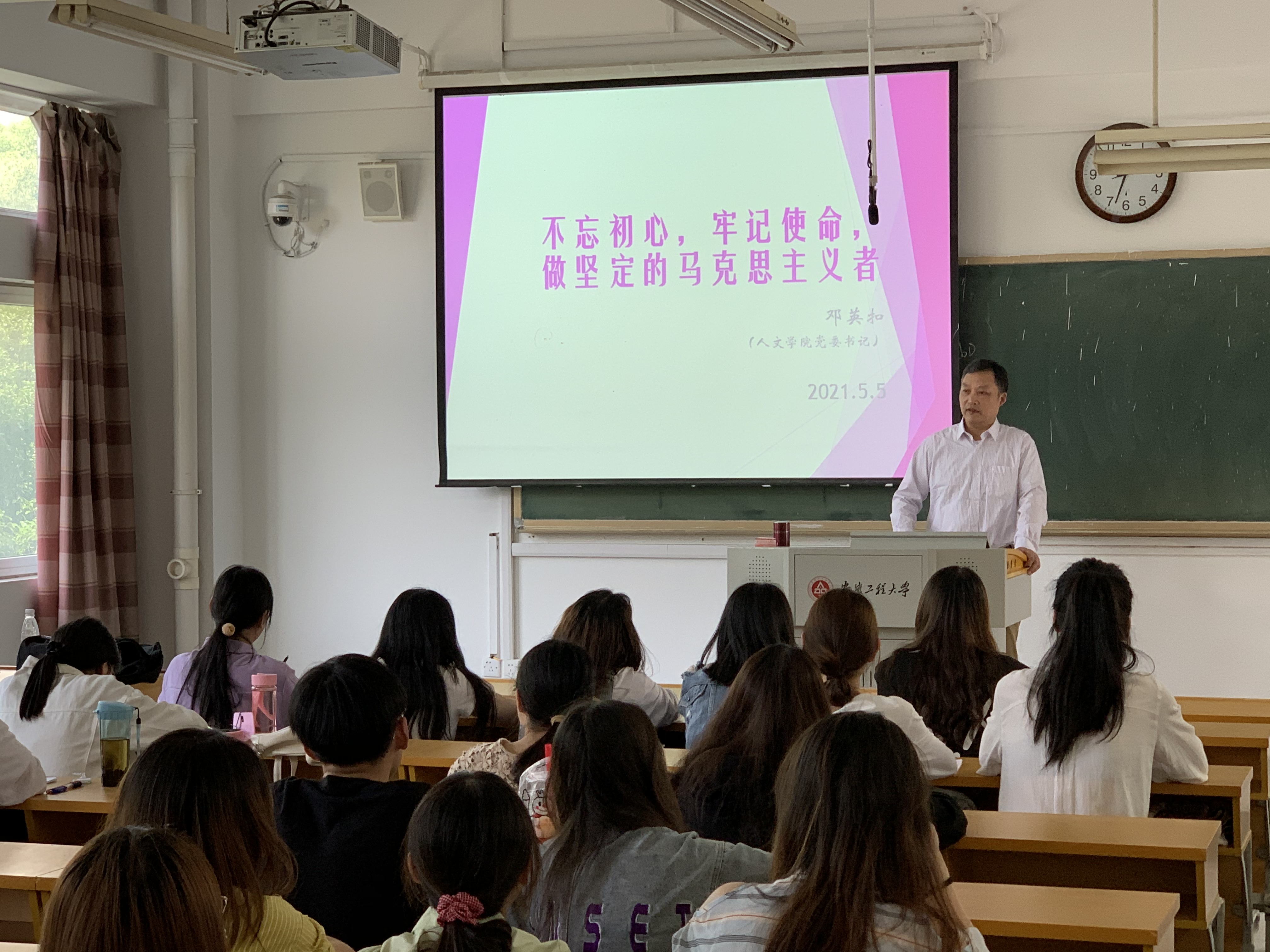 为进一步推进党史学习教育,巩固“不忘初心、牢记使命”主题教育成果,加强入党积极分子培训班学员政治修养,2021年5月5日下午,学院党委书记邓英扣以“不忘初心、牢记使命,做坚定的马克思主义者”为题,给人文学院分党校第26期入党积极分子培训班学员上了一堂精彩的专题党课。人文学院分党校第26期入党积极分子培训班全体学员参加了专题党课学习。
