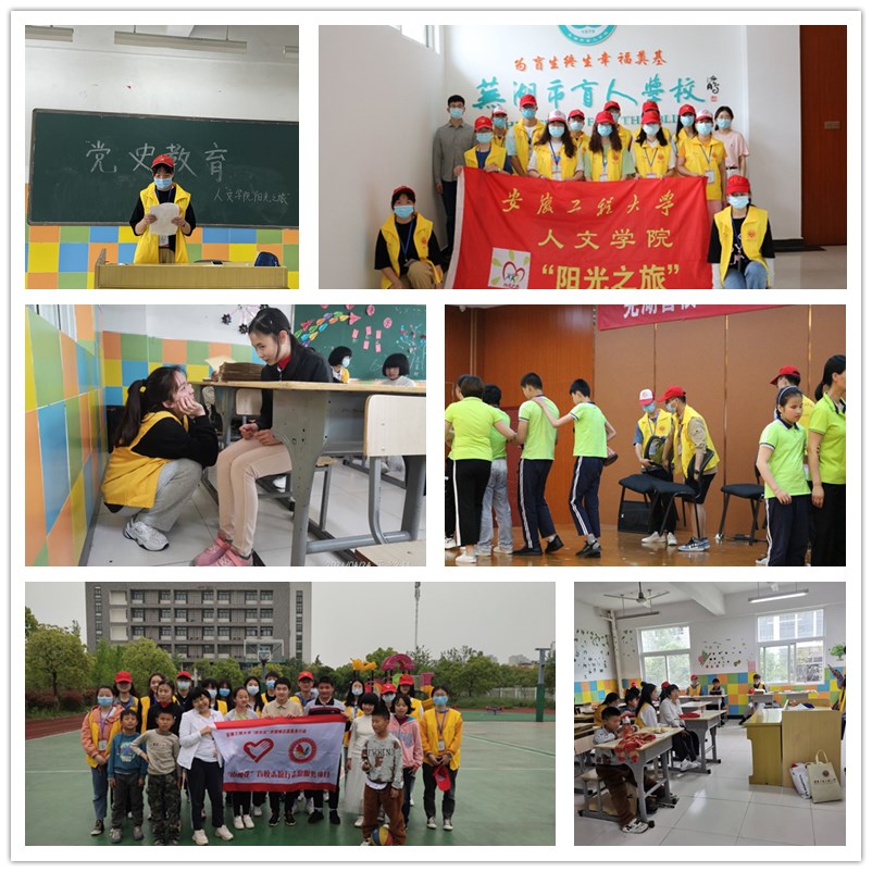 4月24日下午,人文学院“阳光之旅”青年志愿者服务队前往芜湖盲校,开展以党史学习教育为主题的志愿服务活动。在建党一百周年的大背景下,全国上下广泛开展党史学习教育,“阳光之旅”青年志愿者服务队也积极响应人文学院团委号召,将党史学习教育带进盲校,加强盲童们对党史知识的学习。志愿者向盲童介绍了中国共产党的发展历程和英雄人物的事迹。为了提高党史学习的趣味性和积极性,志愿者们还准备了有奖竞猜环节,盲童们都积极抢答,对于党史教育的学习热情空前高涨,盲童们叽叽喳喳的围绕在志愿者的身边,誓要志愿者们答应下次来继续讲党史故事才肯罢休。志愿者们答应下次继续和大家讲故事之后,盲童们方才依依不舍的目送志愿者离开。