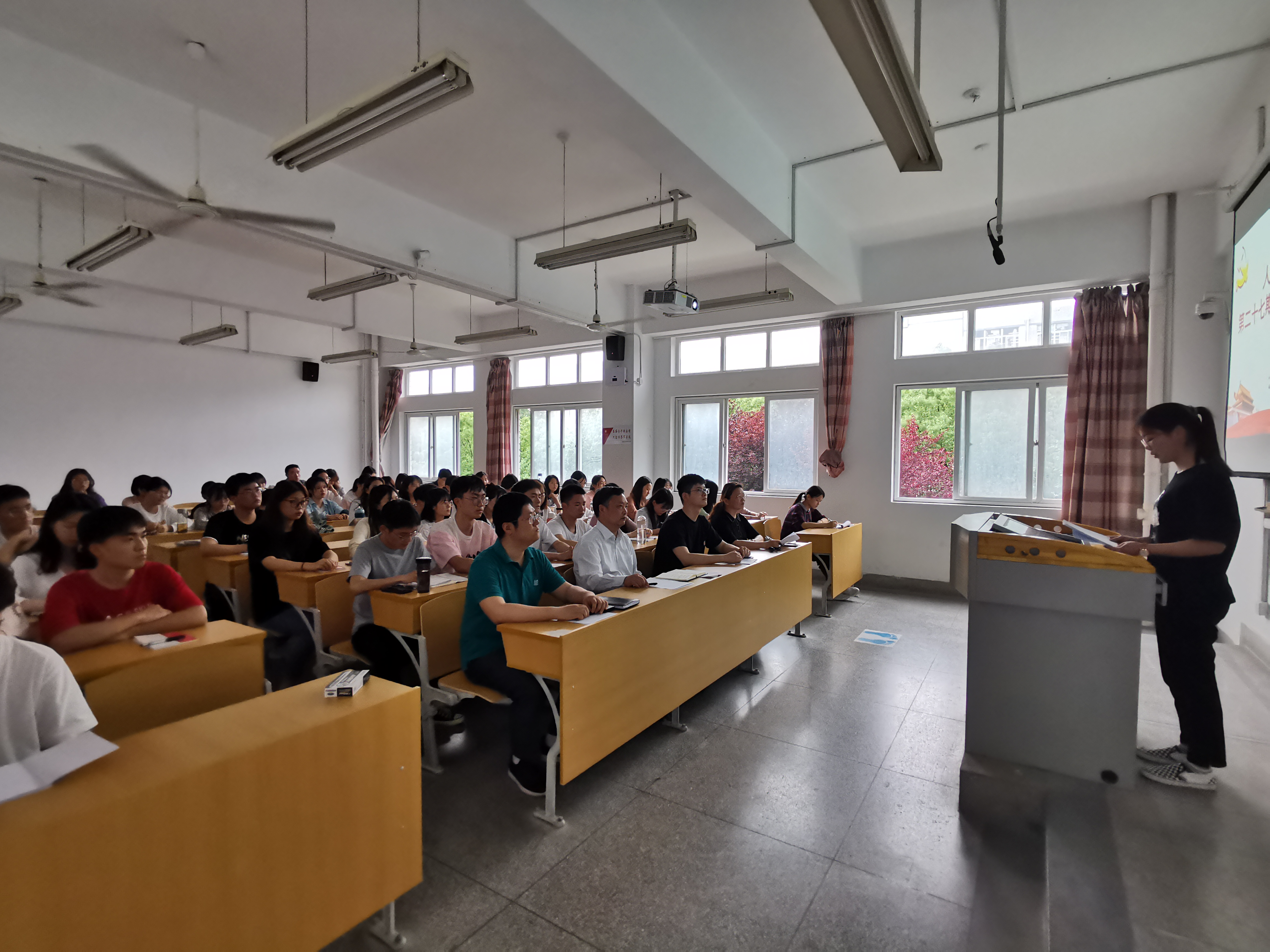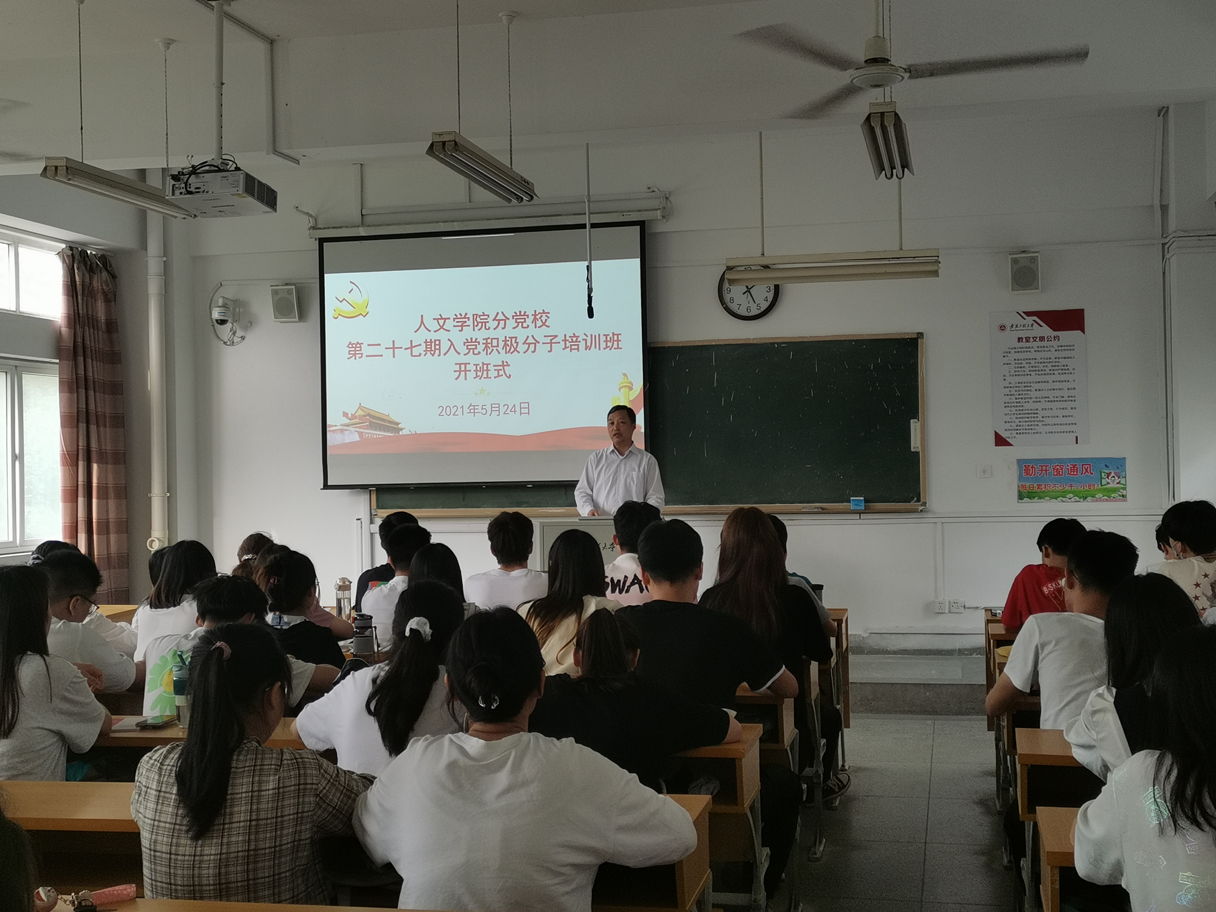 为深入学习贯彻习近平新时代中国特色社会主义思想,加强入党积极分子党的基本理论和基本知识教育,以昂扬姿态迎接建党100周年。人文学院分党校第二十七期入党积极分子培训班于2021年5月24日下午在4教204教室举行开班式。院党委书记邓英扣、党委副书记金艾裙、组织员、班主任以及本期培训班全体学员参加开班式,开班式由金艾裙主持。