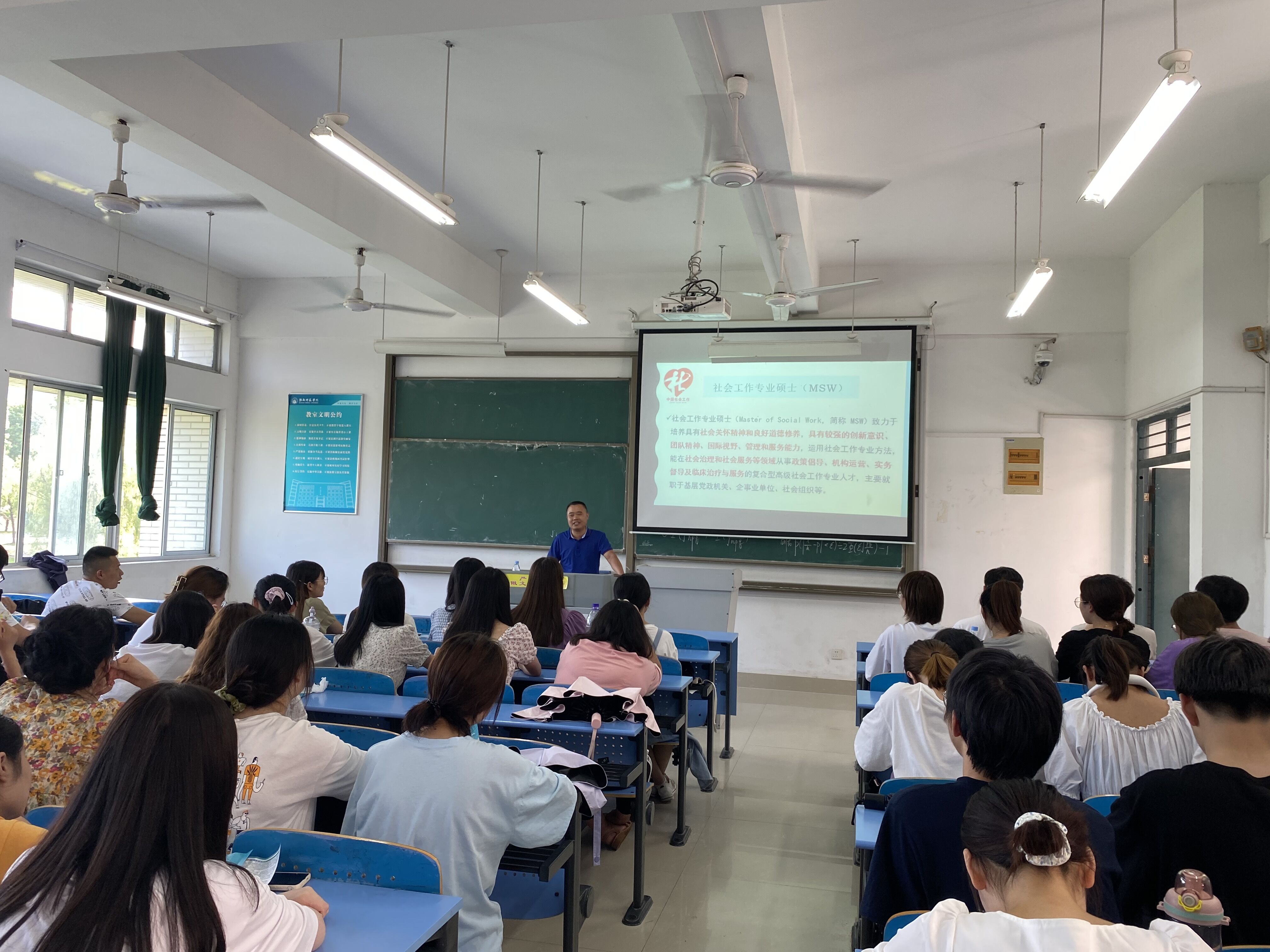 会后,邓英扣一行前往教学楼进行了研究生招生宣传,活动现场,学生对专业历年录取情况、专业课考试科目等进行了详细咨询,邓英扣、余承海为学生一一解答,现场气氛热烈,此次宣传活动为有意愿报考我校社会工作专业研究生的同学提供了专业的报考指导,加强了与淮南师范学院的沟通和联系。