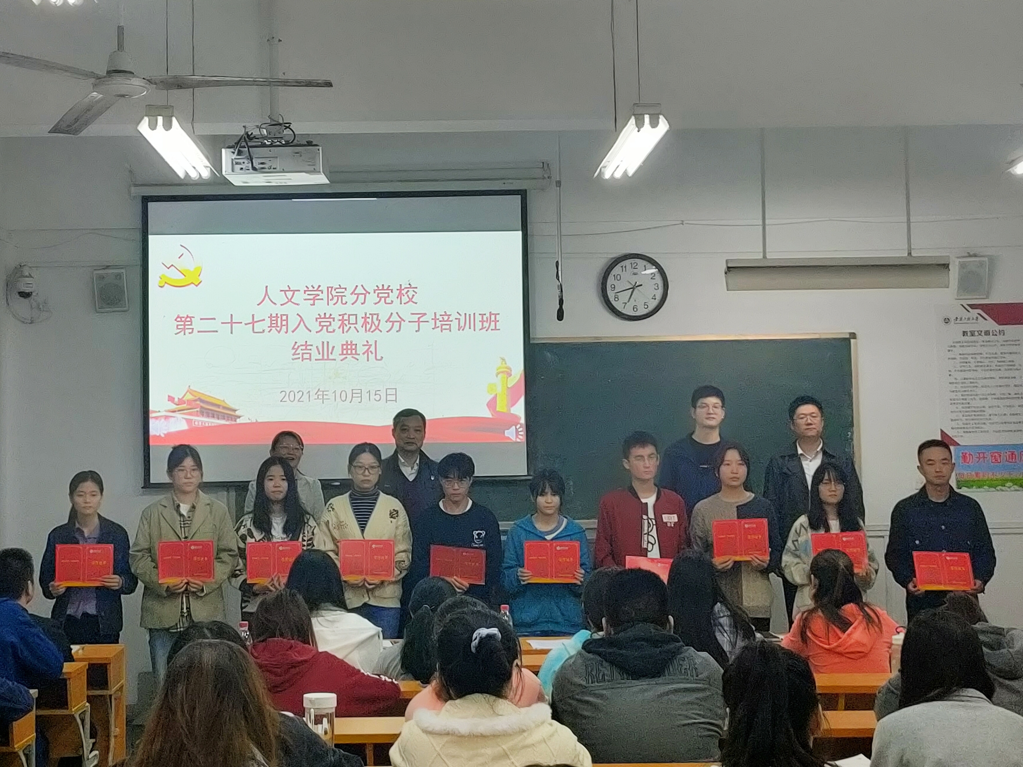 2021年10月15日晚上,人文学院分党校第二十七期入党积极分子培训班结业典礼在4教205隆重举行,人文学院党委书记邓英扣、党委副书记金艾裙、组织员、班主任及第二十七期入党积极分子培训班全体学员共同出席了本次结业典礼。结业典礼由金艾裙主持。