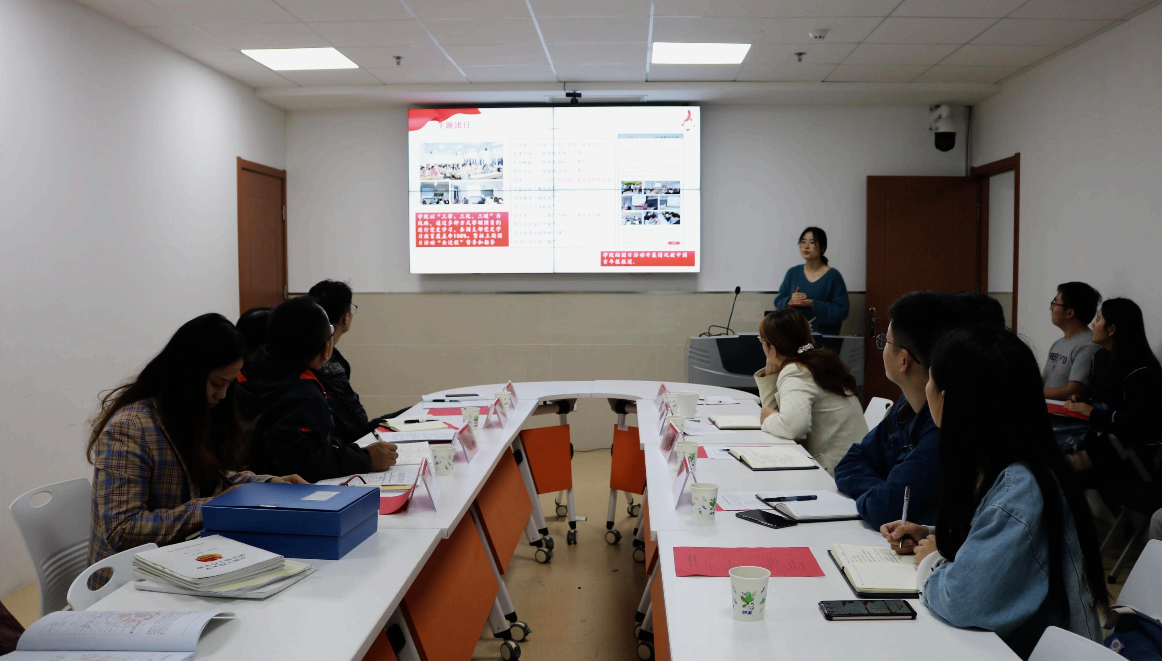学院团委书记谢红翠以“五“心”同筑,打造有文化,有温度,有情怀的团学组织为题从思想引领,组织建设、能力提升,文化底蕴,暖心志愿等五个方面进行了总结汇报,并对学院2022年共青团工作目标与思路进行了展望与分享。随后校团委互学互助组工作人员查阅学院团委工作手册、团支部工作手册、团支部书记例会记录本等材料,并与在场的老师和学生进行详实交流。