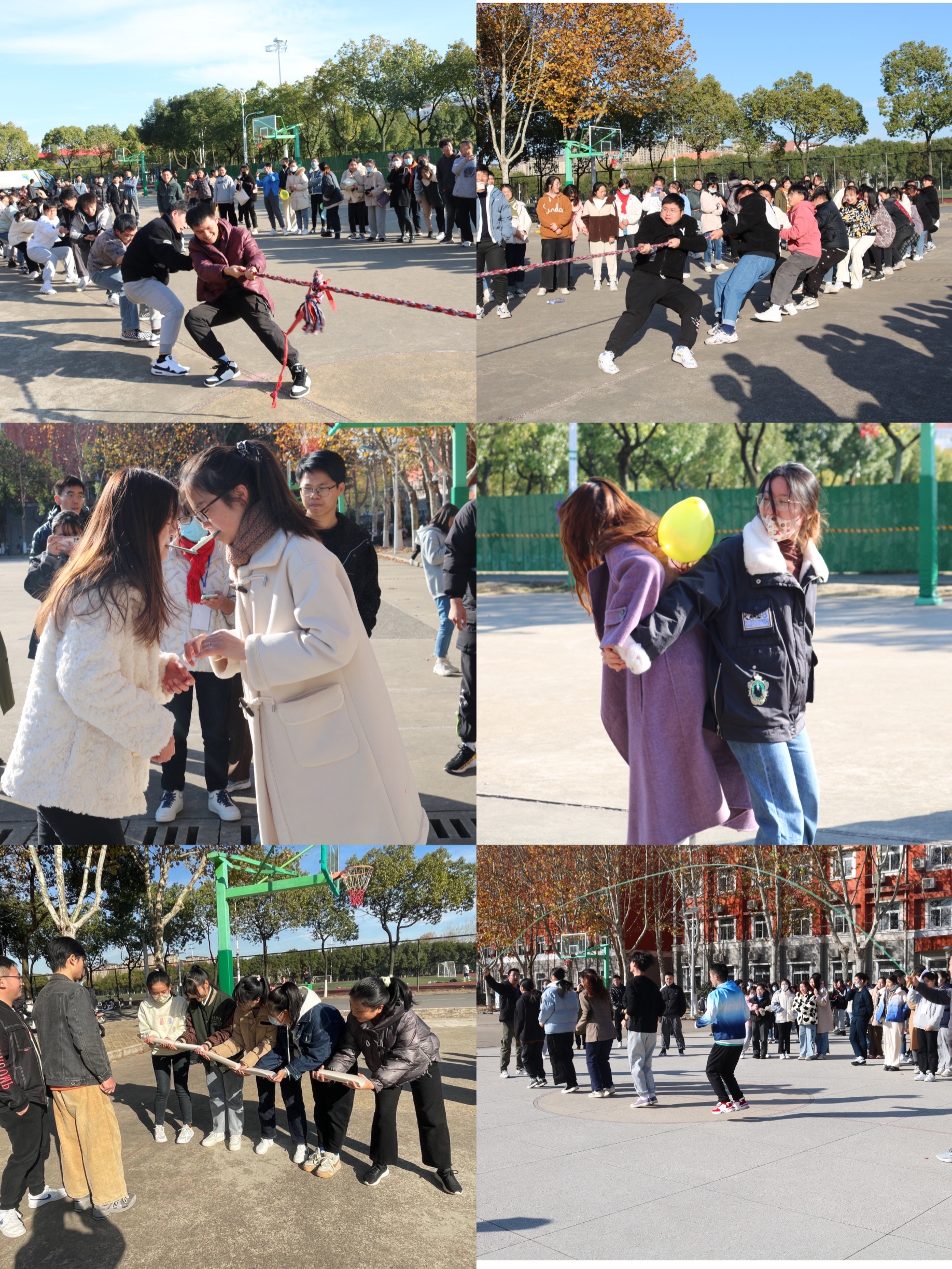 本次比赛共分为五个项目:乒乓球传递、面粉传递、爱的爆抱、跳大绳、拔河。各个队伍精诚团结,通力合作,最终,行管202班获得了本次操场之行活动的一等奖。