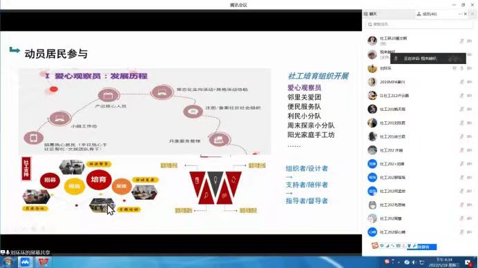 首先,刘环环以民生社会工作服务社为例认真讲述了民生社会工作服务社作为安徽省最早成立的专业社工机构,扎根社区十余年,聚焦于老年社会工作,注重社工人才培养,助力本地社工建设,取得了一系列的实践经验和成果,在老年社会工作领域收获颇丰。然后,刘环环通过对“西园街道居家养老合作社”案例进行展示,让大家了解到了西园街道养老合作社是如何运行的。最后展示并生动讲述了“社工角色点滴瞬间”这一模块的内容。