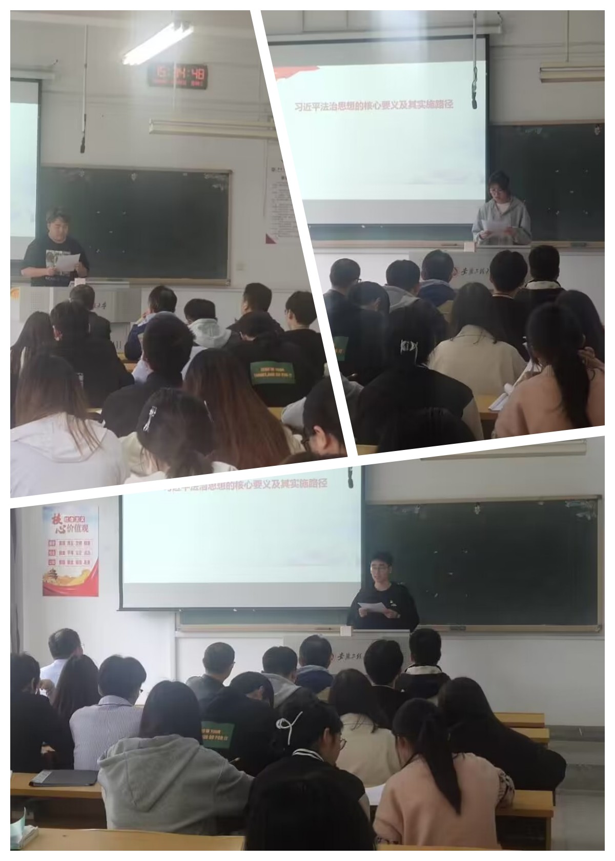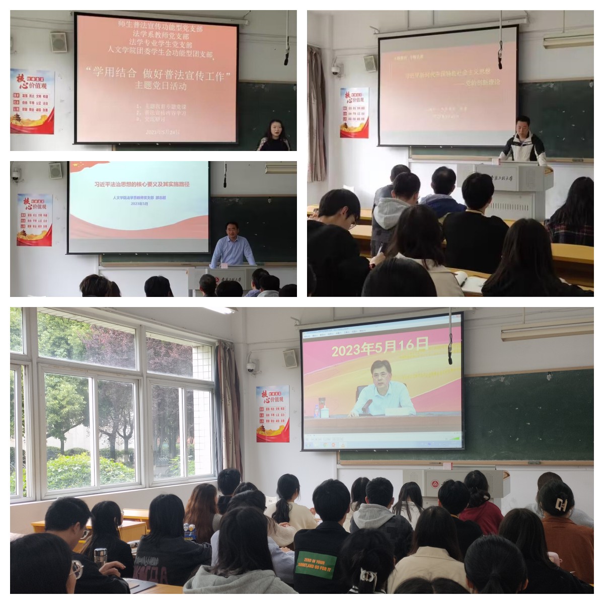 支部书记张雷和支部宣传委员邵志超围绕“四个讲清楚”分别以《习近平新时代中国特色社会主义思想——党的创新理论》和《习近平法治思想的核心要义及其实施路径》为题,讲授了主题教育专题党课。活动中,现场师生还共同学习了习近平总书记关于教育的重要论述摘编,观看了校党委书记张志宏的专题党课视频。在交流研讨时,法学专业学生党支部和人文学院团委学生会功能型团支部的4名同学作为代表上台发言,发表了自己的心得感悟,作为新时代法学专业大学生,应深入学习习近平法治思想,增强法治意识,培养法治思维,提升法治素养,做到自觉守法、遇事找法、解决问题靠法。