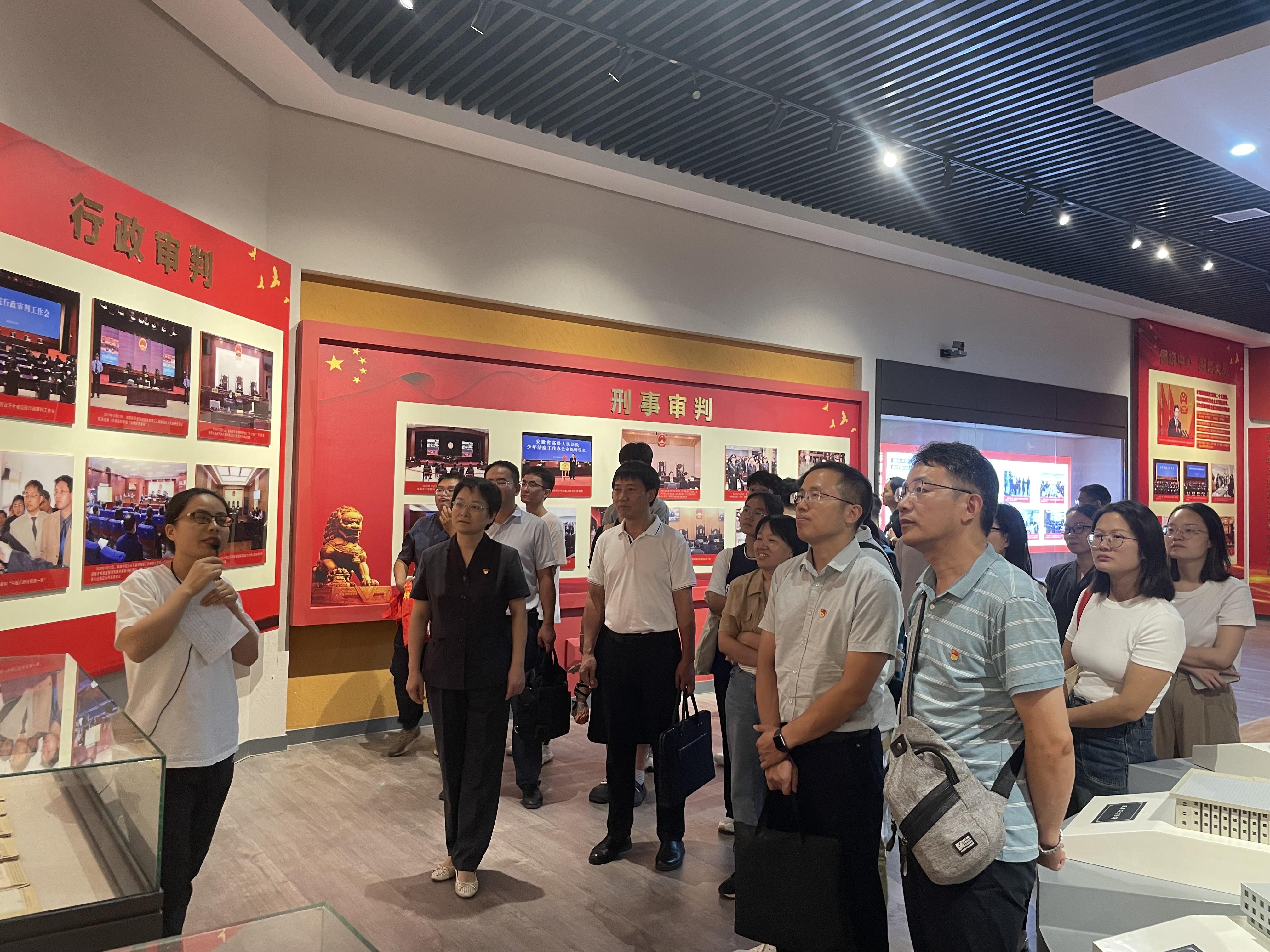 下午,团队成员来到安徽省高级人民法院司法陈列与廉政法治教育基地,开展法治文化建设专题调研。在滨湖审判法庭5楼,团队成员依次参观了院史陈列室、廉政教育室、法治宣传室,仔细察看安徽法院历史沿革和近年来审判执行工作成就以及廉政法治教育开展情况,深切感受到安徽法院独有的红色文化、法治文化、传统文化、创新文化。