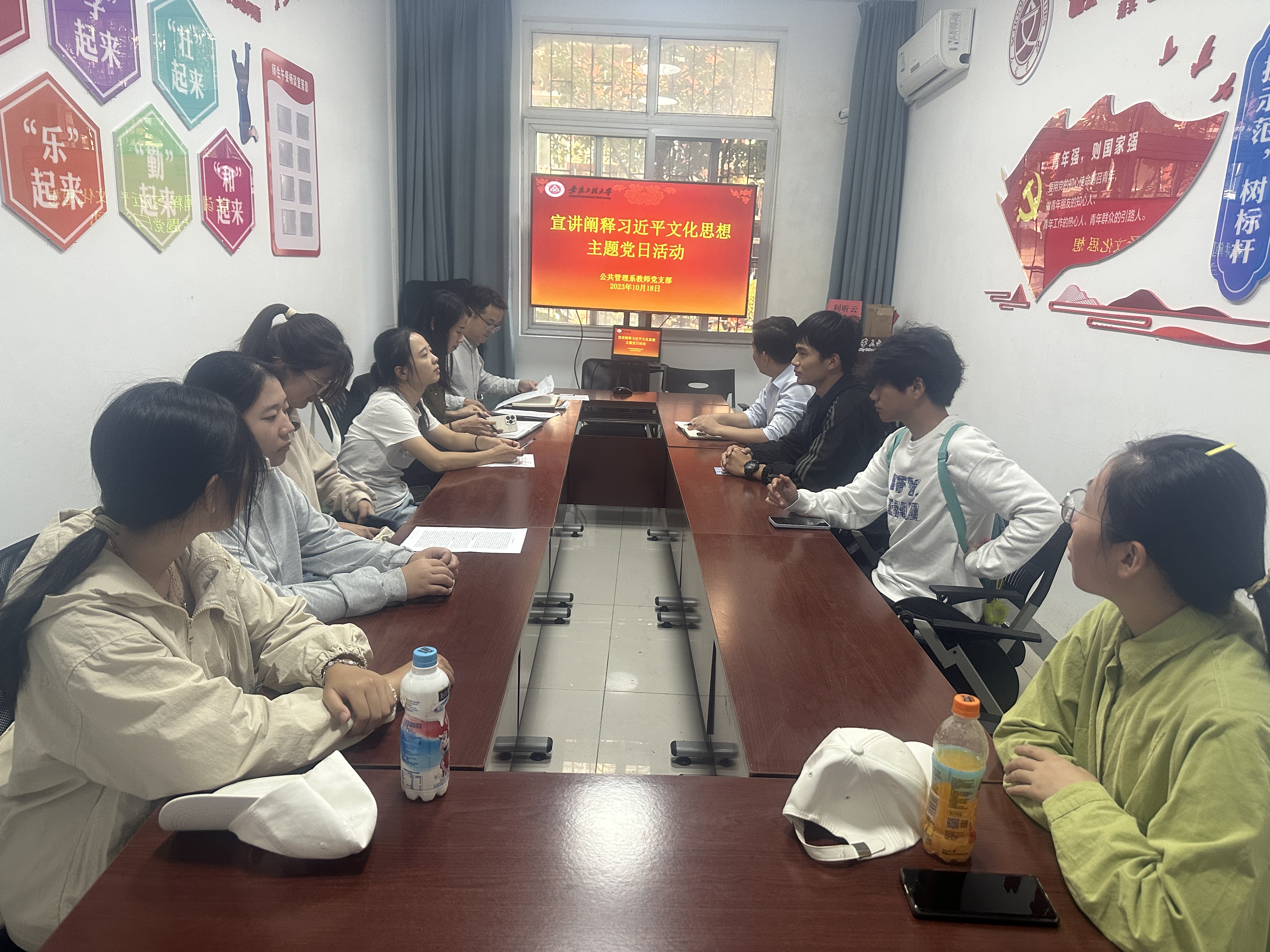 为推进学习贯彻习近平新时代中国特色社会主义思想主题教育走深走实,传达习近平对宣传思想文化工作作出的重要指示精神,10月18日下午,公共管理系教师党支部赴人文学院和谐社区工作站开展“宣讲阐释习近平文化思想”主题党日活动。活动由支部书记方浩伟主持,支部全体党员及行政管理、电子商法及法律专业学生代表参加。