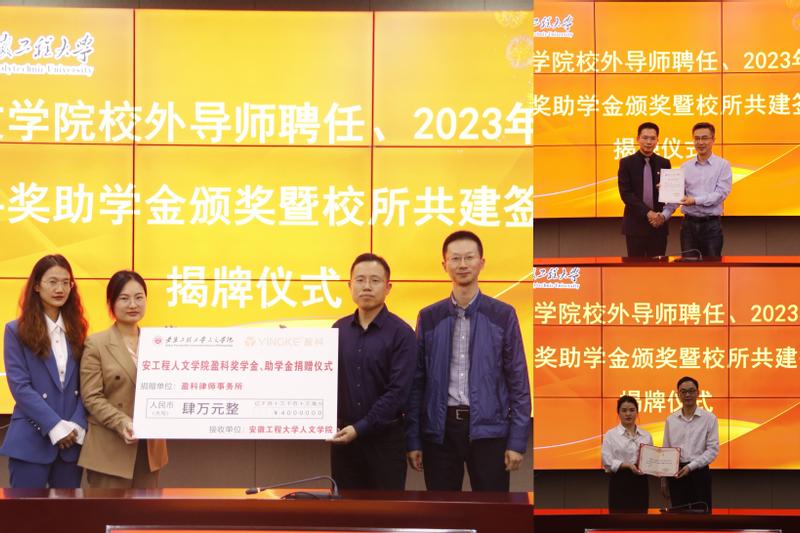随后,张婷、李学蓉代表北京盈科(芜湖)律师事务所、北京盈科(马鞍山)律师事务向获奖学生颁发奖、助学金,由王中江副书记和邹俊副院长代表学生上台领奖。
