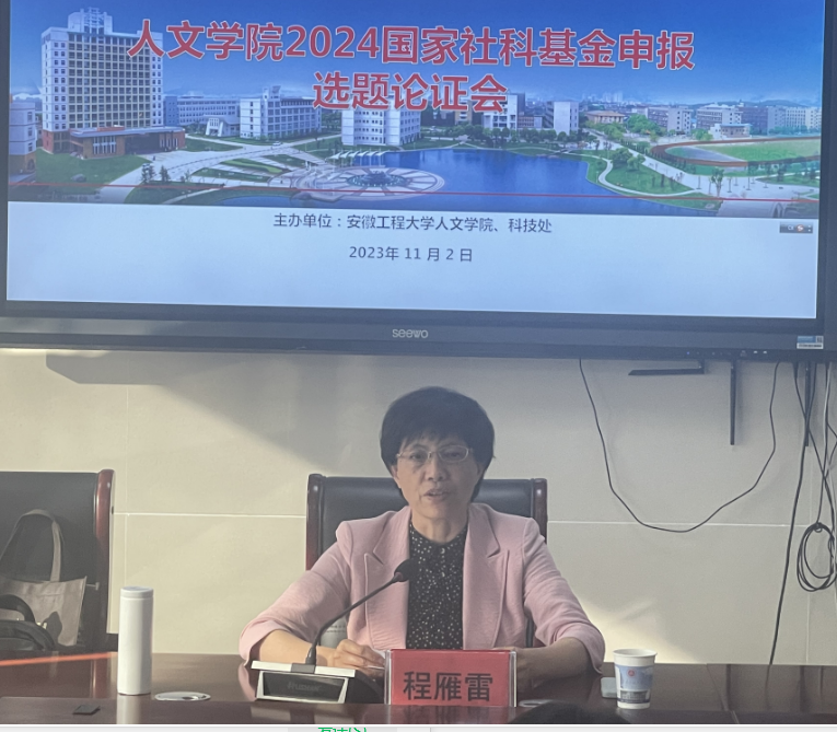 2023年11月2日下午,人文学院2024年国家社科基金申报选题论证会在人文学院1307会议室举办,安徽大学原党委常委、副校长、博士生导师程雁雷教授,应邀出席本次选题论证会,拟申报2024年国家社科基金项目的12名博士教师参加了本次会议,会议由人文学院副院长邹俊主持。
