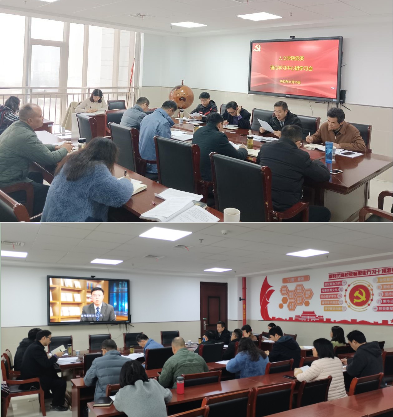 11月15日,校第四列席旁听组成员、生物与食品工程学院党委书记余传文、经济与管理学院党委书记水心宝指导人文学院党委理论学习中心组学习和党政联席会议,会议由人文学院党委书记刘一主持。