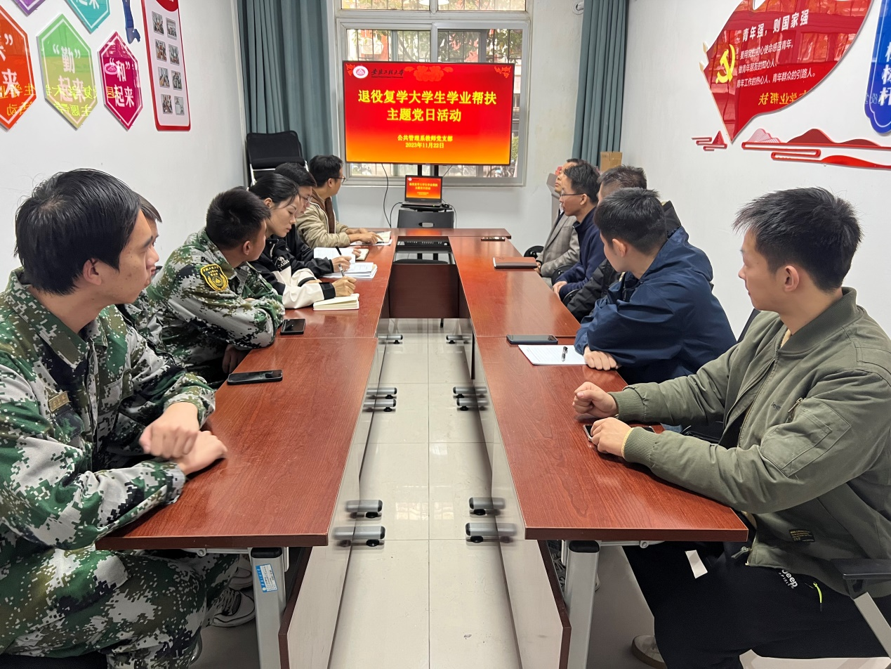 首先,与会师生集体学习了《中国共产党普通高等学校基层组织工作条例》等重点学习内容。随后,每位学生代表分别汇报了退伍复学后的经历和感受,提出了专业课跟不上、集中排课不适应、自主学习效果差、学习动机不充分、发展前景不明确等学业困难问题。党员教师结合各年级学生面临的不同阶段性任务,发挥经验优势,以丰富鲜活的案例,详细回应学生的困惑和疑问,鼓励学生坚定信心,发扬军人优秀品质,努力克服暂时的困难。支部还对陷入学习困境的学生提出预警,耐心倾听,为其深入剖析原因,商讨帮扶措施。