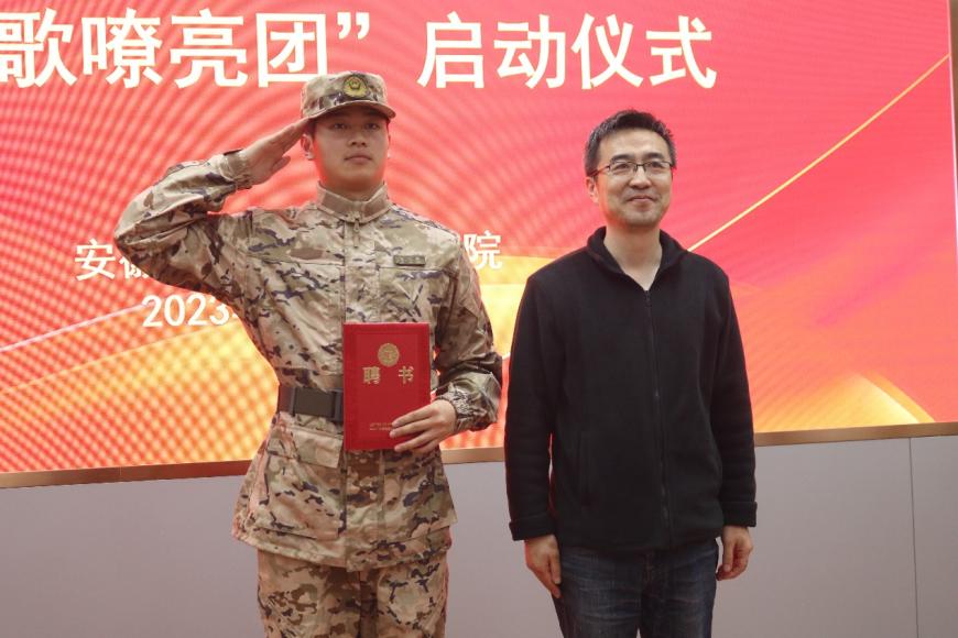 随后,刘一、王中江分别为“军歌嘹亮团”团长法学212贺行郑、副团长社工研23胡天麒、副团长行管(升)231郭威莉颁发聘书,并合影留念。团长法学212贺行郑作为“军歌嘹亮团”代表发言,他表示“军歌嘹亮团”将积极发挥退役大学生在“三全六专”工作中的引领示范作用,将部队优良作风传递给身边的同学,坚决树立起“退伍不褪色”的良好形象。