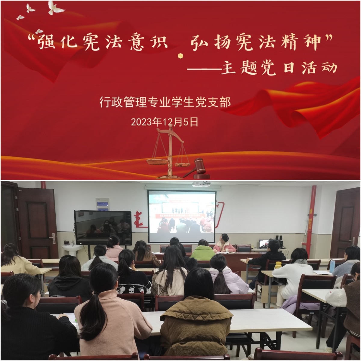 为深入学习贯彻党的二十大精神,贯彻落实习近平法治思想和习近平总书记关于宪法法治教育的重要指示精神,进一步营造尊崇宪法、维护宪法的浓厚氛围,12月5日,行政管理专业学生党支部开展“强化宪法意识,弘扬宪法精神”主题党日活动。活动由支部书记李娜主持。