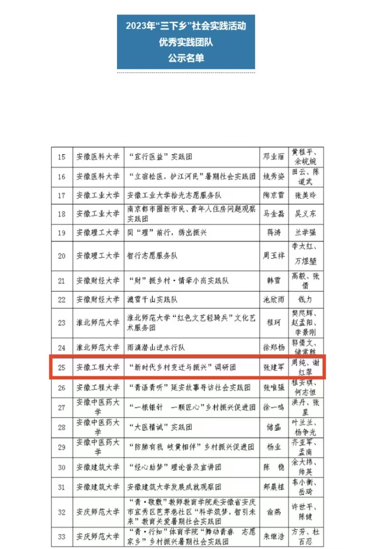 为深入学习宣传贯彻党的二十大精神和习近平新时代中国特色社会主义思想,坚决贯彻落实习近平总书记关于青年工作的重要论述,进一步引导和帮助广大青年学生上好与现实相结合的“大思政课”,在社会课堂中“受教育、长才干、作贡献”,坚定信念听党话、跟党走。近日,根据《关于做好2023年安徽省大中专学生志愿者暑期文化科技卫生“三下乡”社会实践活动总结工作的通知》要求,经资格审查、专家评选、结果复审等环节,2023年安徽省大中专学生志愿者暑期文化科技卫生“三下乡”社会实践活动有关名单公示,RayBetApp官网下载 人文学院“新时代乡村变迁与振兴”调研团获得“2023年全省大中专学生志愿者暑期‘三下乡’社会实践活动优秀实践团队”荣誉称号,其撰写的调研报告获得“2023年全省大中专学生志愿者暑期‘三下乡’社会实践活动优秀调研报告二等奖”。