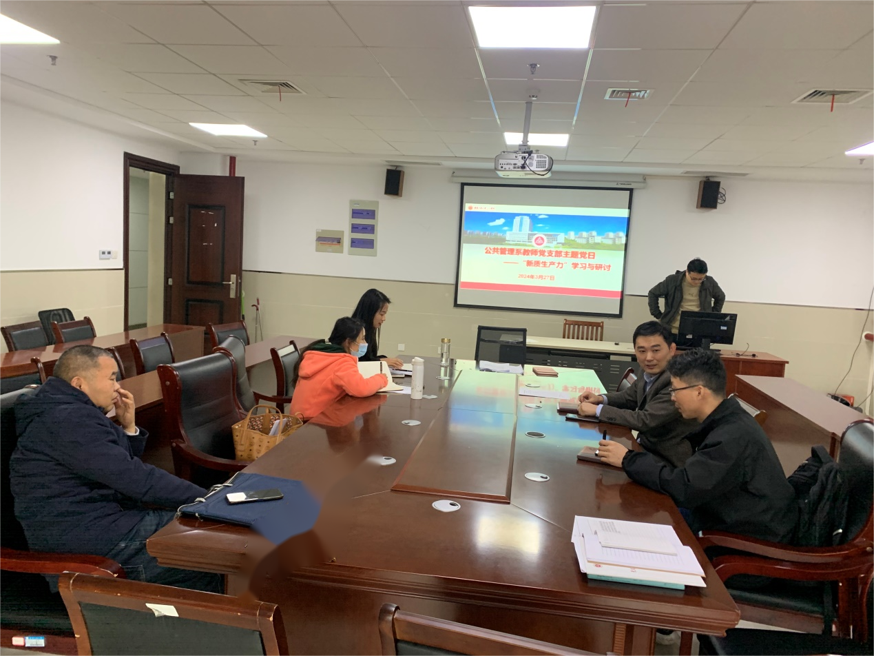 为推动系部教师党员深入学习贯彻全国“两会”精神,准确理解和全面把握新质生产力的科学内涵,3月27日下午,公共管理系教师党支部在图书综合楼1215会议室开展“新质生产力”理论学习与研讨主题党日活动。活动由支部书记方浩伟主持,支部全体党员参加。