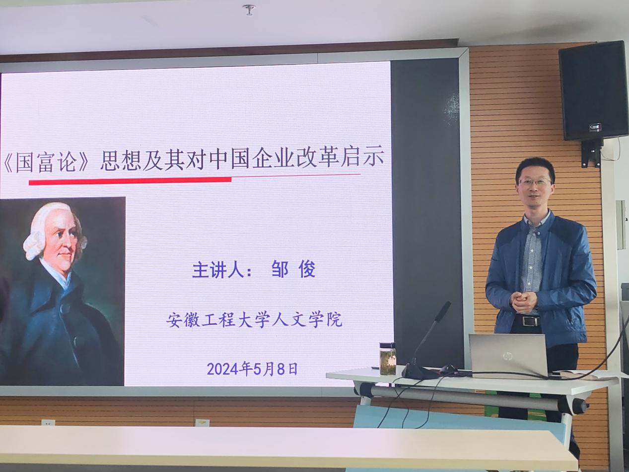为积极落实党委“三专六全”育人实践工作,深入学习宣传贯彻党的二十大精神,引导学生“正”起来,“学”起来,“乐”起来,5月8日下午,校第四期“经典悦读”班在图书馆综合楼722室举办阅读分享会。本次阅读会分享主题是“《国富论》思想及其对中国企业改革启示”,由人文学院副院长邹俊主讲,“悦读”班全体成员参加。