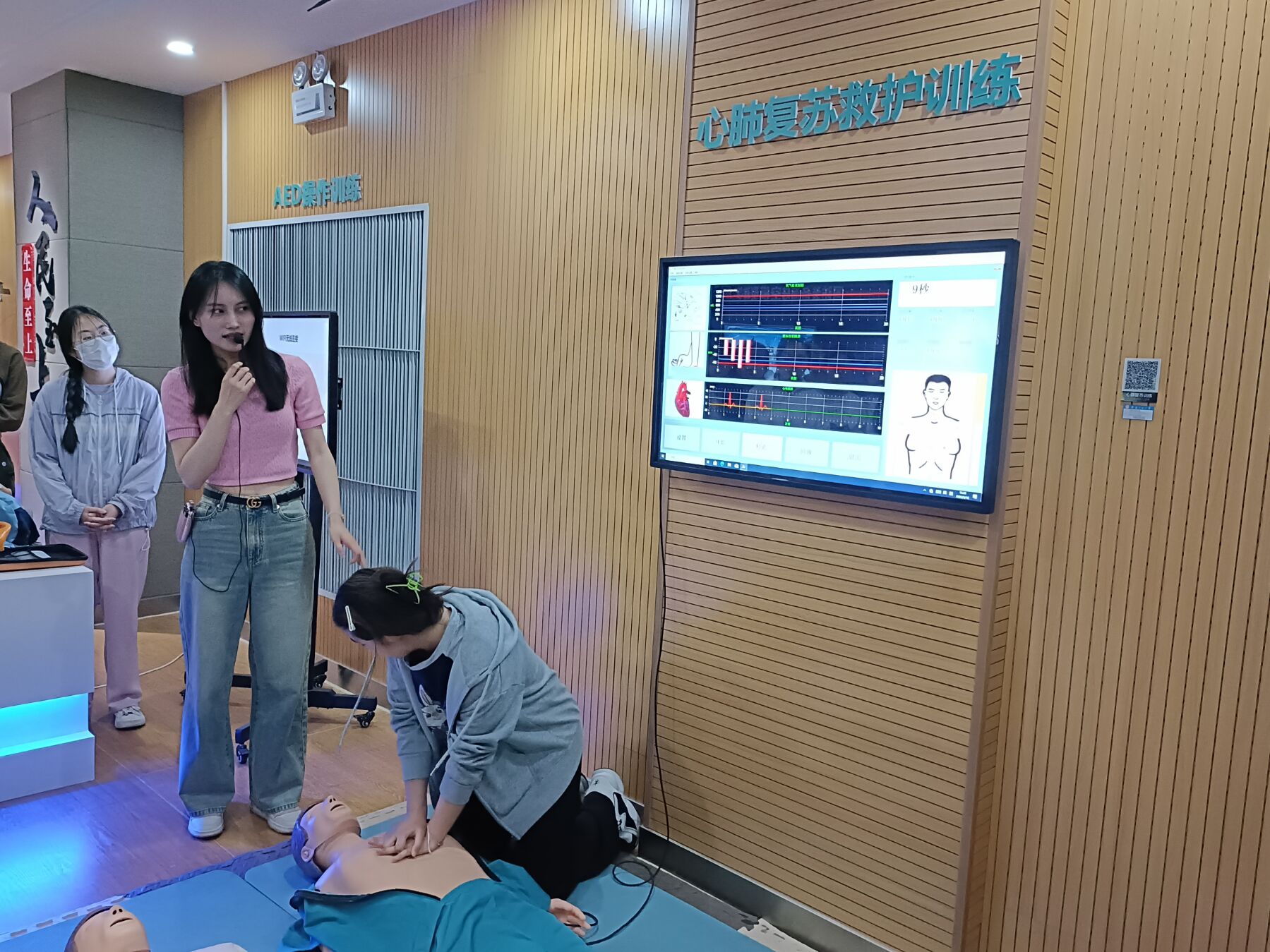 在消防安全教育区,李老师从消防安全常识的普及到紧急情况下的自救互救技能,进行了全方位、多角度的展示与讲解。在互动环节,同学们积极参与,争相体验消防器材、模拟急救场景。