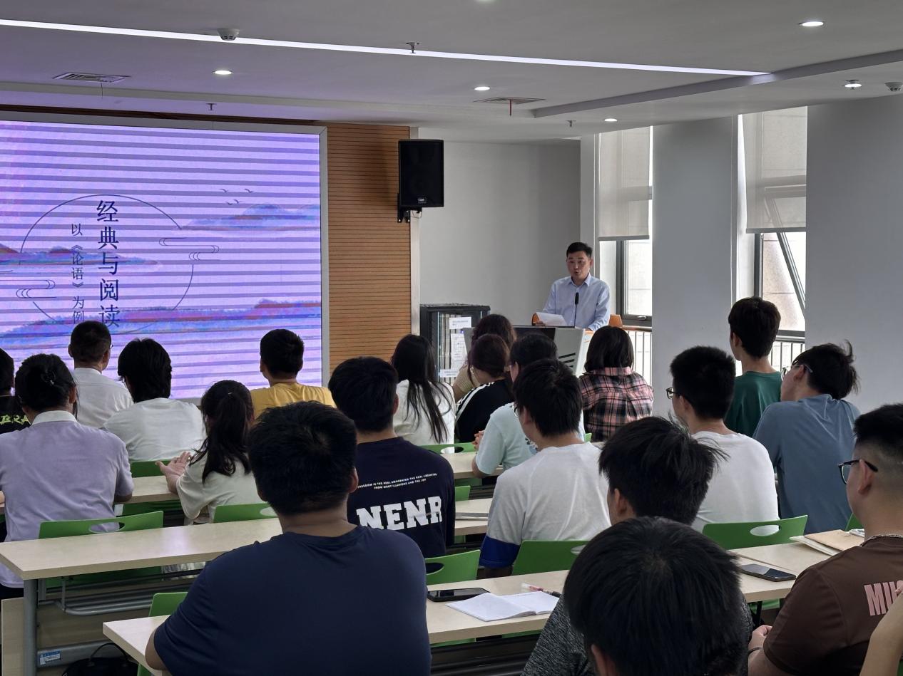 为深入学习贯彻习近平文化思想,全面贯彻落实党的二十大关于文化建设的战略部署,落实学校党委“三全六专”育人实践工作,5月22号下午,校第四期“经典悦读”班举办“文化建设”专题报告会。马克思主义学院教授张刚受邀作题为“经典与阅读—以《论语》为例”的专题报告,人文学院副院长张勇主持报告会,“悦读”班全体师生聆听了报告。