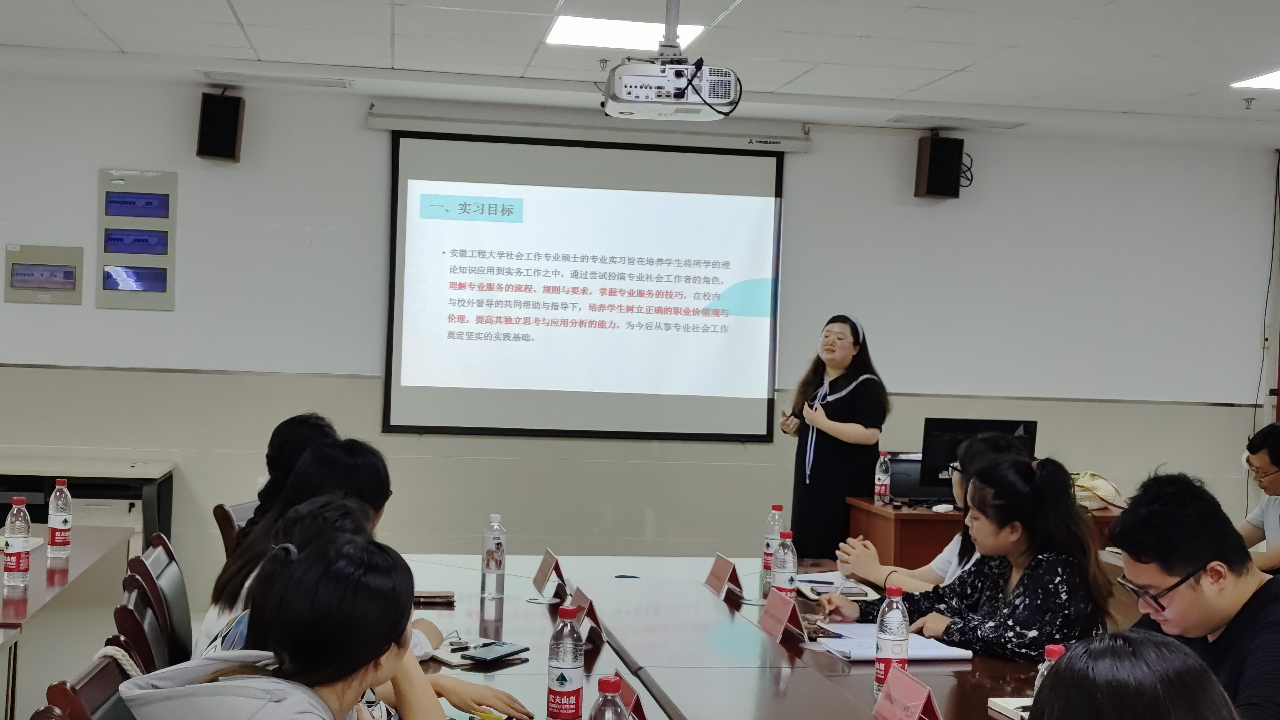 周纯详细介绍了本次专业实习的目标、要求和任务,着重强调了实习的重要性和必要性。她要求全体同学正确认识实习,明确实习任务、珍惜实习机会、端正实习态度、遵守实习规定,在树立正确职业价值观前提下提高自身专业能力,努力实现个人价值和社会价值的统一,最终实现个人的成长为今后从事专业社会工作奠定坚实的基础。