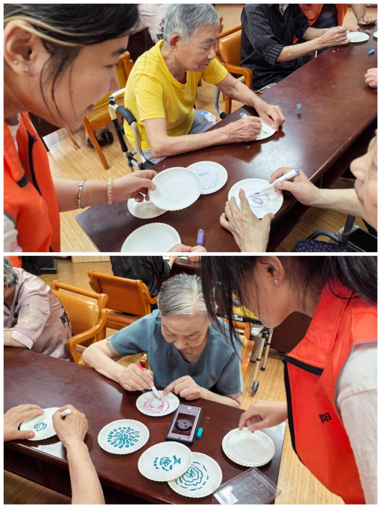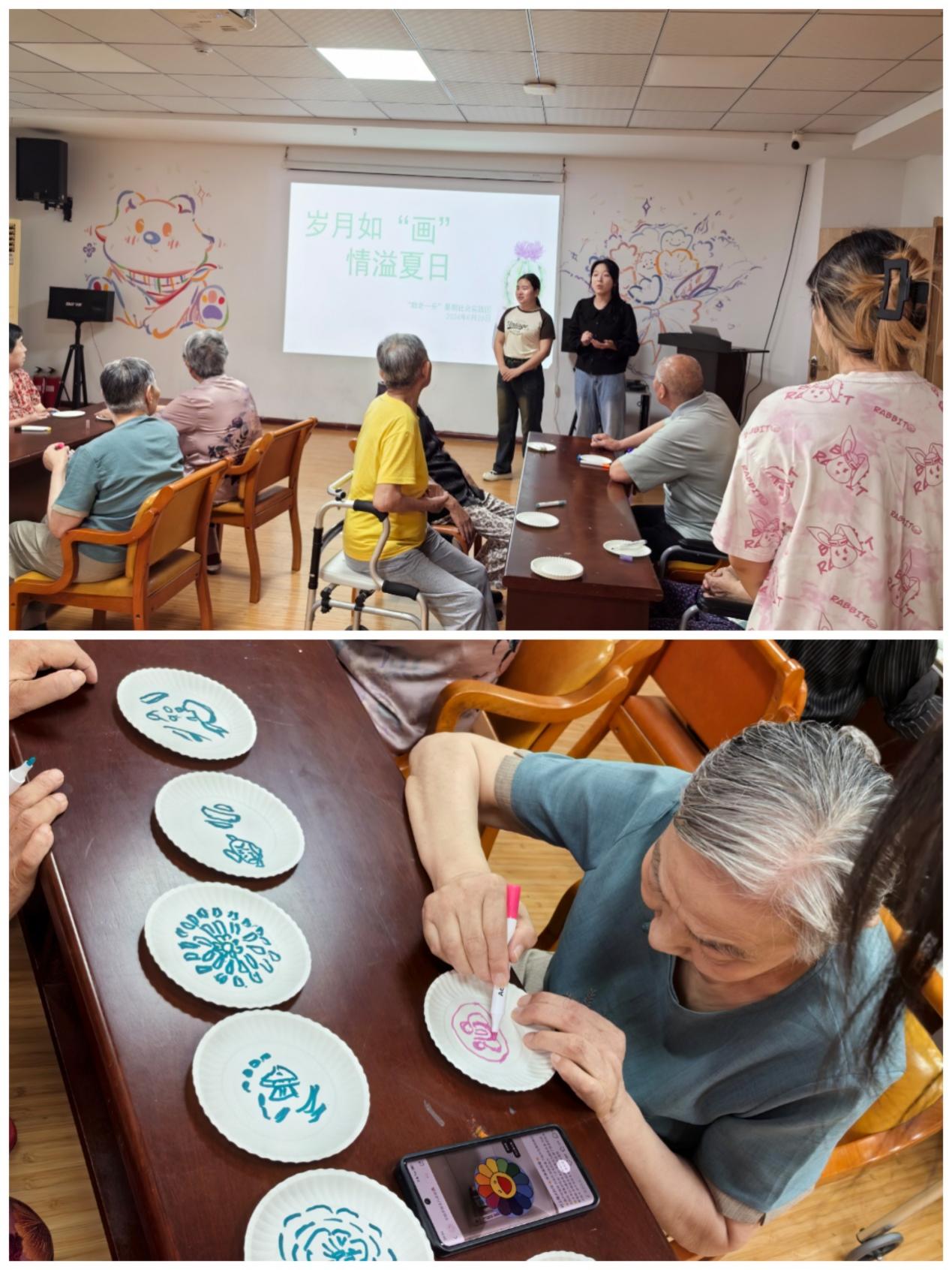 6月29日,团队走进了金太阳长者照护中心,带领老人共同完成纸盘画的创作活动。在实践团成员们的鼓励和引导下,许多老人展开了想象的翅膀,创作出了充满个性的作品。这些作品不仅展示了老年人的艺术天赋,也成为了他们自我表达和情感寄托的载体。