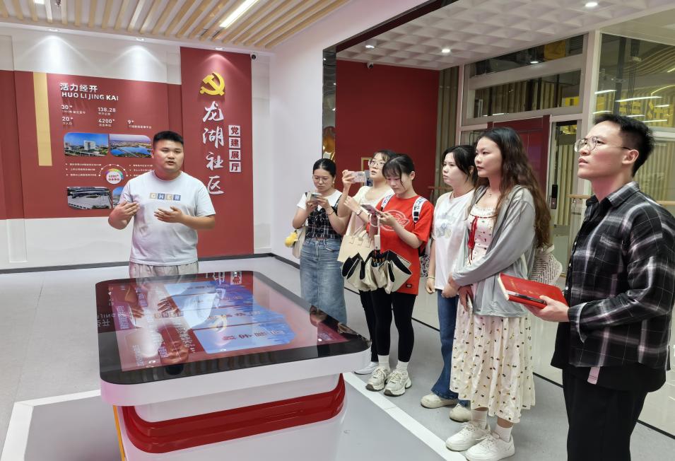 抵达龙湖社区后,大家首先走进了龙湖社区党群服务中心。这里不仅是社区党员群众活动的重要阵地,也是展示社区党建成果的前沿窗口。在社区工作人员的引领下,大家详细参观了服务中心的各个功能区,从党员活动室到图书阅览室,每一处都透露着浓厚的党建氛围。随后,龙湖社区李姚书记以生动的语言和详实的资料,为师生们讲述了龙湖社区自成立以来的党建发展历程,特别是近年来在创新党建模式、提升服务质量方面所做出的努力和取得的成就,让在场的每一位师生都深受启发。