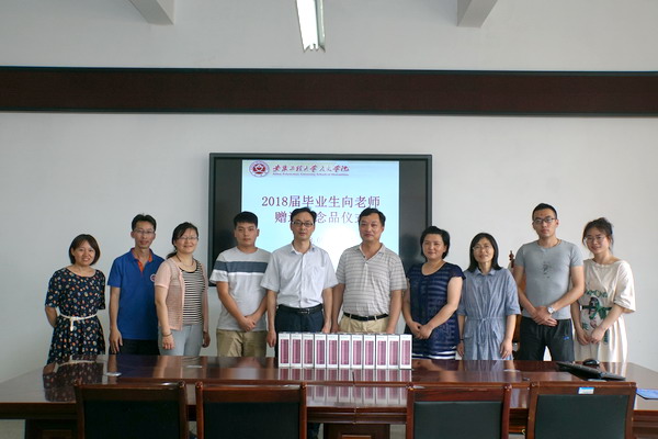 感恩母校,难忘师恩。6月27日下午,人文学院2018届毕业生给老师赠送纪念品仪式在九教举行。院党委书记邓英扣,院长刘军,党委副书记金艾裙,教师代表杜蓓蕾、蒋艳、汪茂泰以及毕业生代表周明明、王沛奇参加此次仪式。