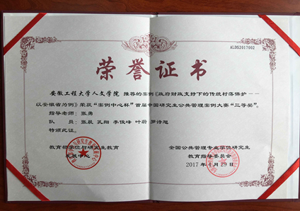 硕士点获批以来,积极组织与参加MPA教指委举办的各项活动,2016年5篇案例成功入选中国公共管理专业学位教学案例中心,入库数量居安徽省MPA培养院校首位;2017年教育部学位与研究生教育发展中心、全国公共管理专业学位研究生(MPA)教育指导委员会联合主办的“案例中心杯”首届“中国研究生公共管理案例大赛”中心MPA代表队荣获三等奖(安徽省唯一奖项)。
