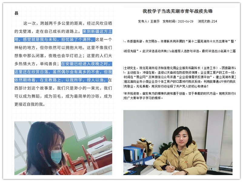 人文学院通过线上线下双管齐下的方式深化大学生思想教育。借助“青马工程”大学生骨干培训班培养出一批批有理想有道德有文化有素质的青年骨干,利用“新生入学教育”深化学生对团学工作的认识,将理想信念教育落实到有形的组织依托和生动的活动载体之中。同时学院团委充分发挥学院团组织自身的优势,积极开展富有时代气息的主题团日活动,如围绕“五四运动一百年”“新中国成立70年”等开展团日活动。学院这几年涌现出一批有志于家乡发展的大学生村官和无私奉献参与西部计划投身西部开发的优秀学子,例如行管16级学生徐小婷,行升17级学子陈梦晗等等。在2020年疫情期间,人文学子积极响应抗疫号令,勇于挑起时代赋予的重担,其中我院学子陈赪当选“第十二届芜湖市十大杰出青年”暨“芜湖市青年战役先锋”。