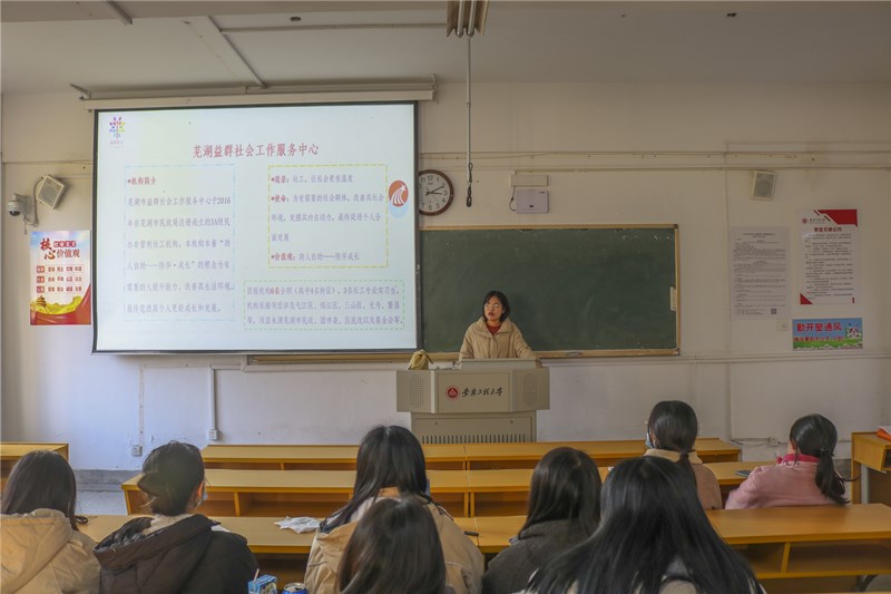 第三场招聘会,芜湖益群社会工作服务中心负责人储晓云通过精心制作的演示文稿向各位毕业生明确展示了薪资待遇等相关资讯。芜湖市益群社会工作服务中心于2016年在芜湖市民政局注册成立的3A级民办非营利社工机构,以“助人自助-陪伴·成长”的理念为有需要的人提升能力、改善其生活环境,最终促进其个人更好成长和发展。宣讲结束后,益群社工先生和同学们进行了热情互动,为同学们答疑解惑。会后,有意向的同学们纷纷提交简历并参加面试。