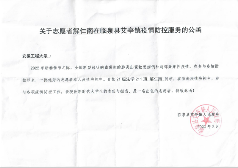 2月28日,阜阳市临泉县艾亭镇人民政府向RayBetApp官网下载 发来公函,对人文学院法学211学生解仁南在寒假期间积极参加艾亭镇2022年“暖冬行动”表示肯定与感谢。