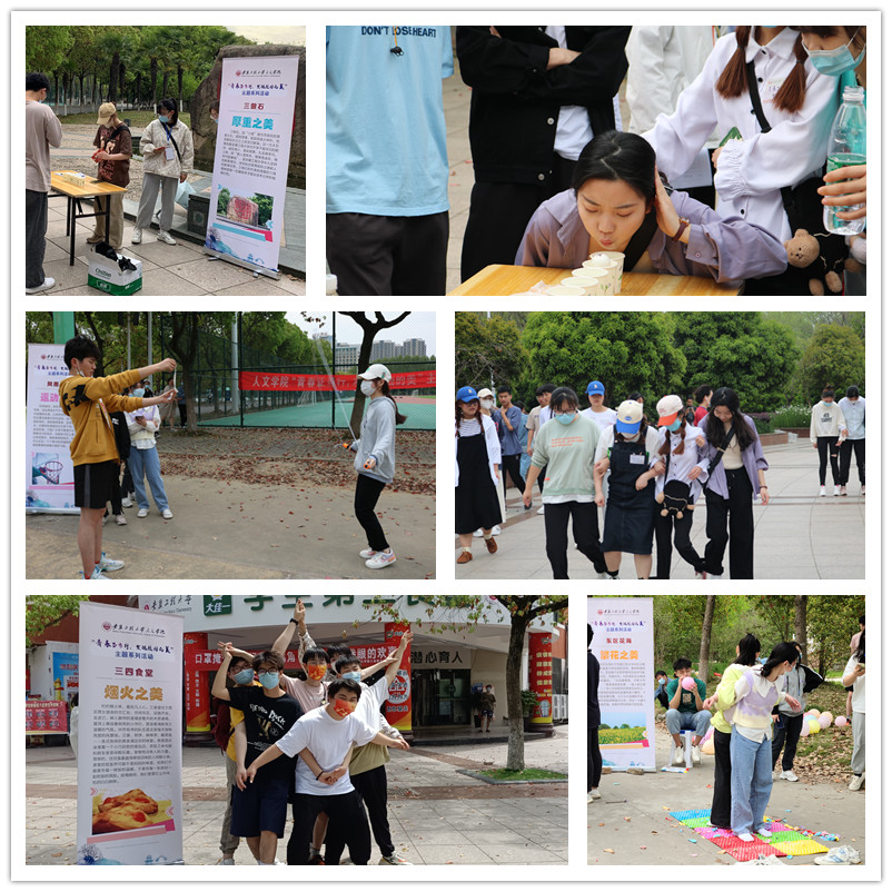 4月10日上午8:30参加校园徒步活动部分同学们在图书馆广场集合,齐声共喊“青春正当行,发现校园美”后,同学们携手开启这场踏春寻美之旅。第一站任务在“三做”石旁,该石是因“做人、做事、做学问”的‘三做’教育理念而得名。“三做”石旁,同学们在激烈紧张的呼气吹气,小小的乒乓球跨越了五个水杯。第二站美丽的油菜花田,两名选手在指压板上背靠背压爆气球,在同学们的默契配合下,圆滚滚的气球“砰砰砰”的爆破,欢乐解压的气氛感染着所有人。第三站师生活动中心,在学校标志性的建筑旁参加四人五足项目的同学在齐心协力、齐头并进的走向终点。下一站来到了西区三、四食堂,同学们按照指示在食堂门口的石楠花下合作摆出特定姿势,由工作人员拍照打卡记录,四羊开泰、吉星高照等姿势层出不穷,充满趣味。“白石白又滑,搬来白石搭白塔……”篮球场传来轻快悦耳的绕口令声,这是本次活动的第六个打卡点,同学们在跳绳的同时完成绕口令 。