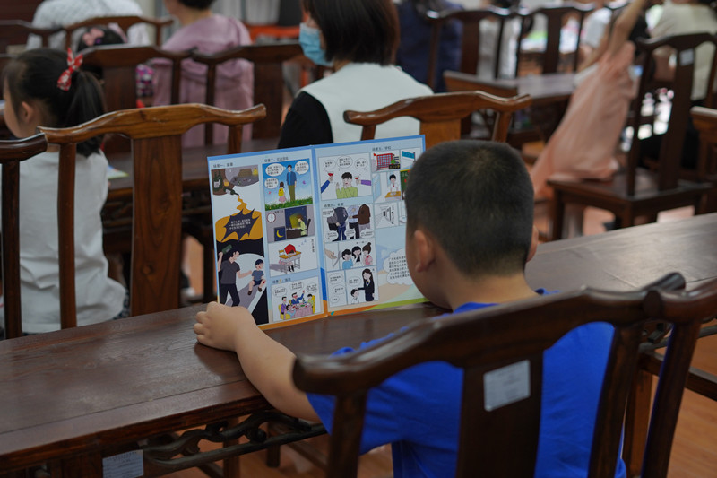 此次活动由法治宣传实践小分队与旭日天都社区“希望之光”志愿服务团队共同开展,延续了团队一贯的“普法宣讲+文创产品”的特色宣讲模式,活动开始过程中将统一印制、自主创作的主题宣传漫画发放给在场的家长、儿童。由法学201孙健同学进行“安全伴我行”主题宣讲,具体从“我不和你走”、“游泳小贴士”“小心电刺猬”、“预防病毒”四个板块生动形象地向儿童们传播安全保护知识,提髙留守儿童自爱自强和自我保护能力。宣讲结束后小分队成员与小朋友们共读宣传漫画、共做防疫手工,其间欢声笑语不断。
