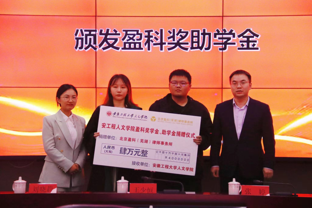 然后,2022年度盈科奖助学金颁奖,刘军宣读了盈科奖助学金学生名单,其中奖学金共3名,助学金共16名。王少恒、张婷代表北京盈科(芜湖)律师事务所向获奖学生颁发奖、助学金,由获得奖、助学金学生代表上台领奖。