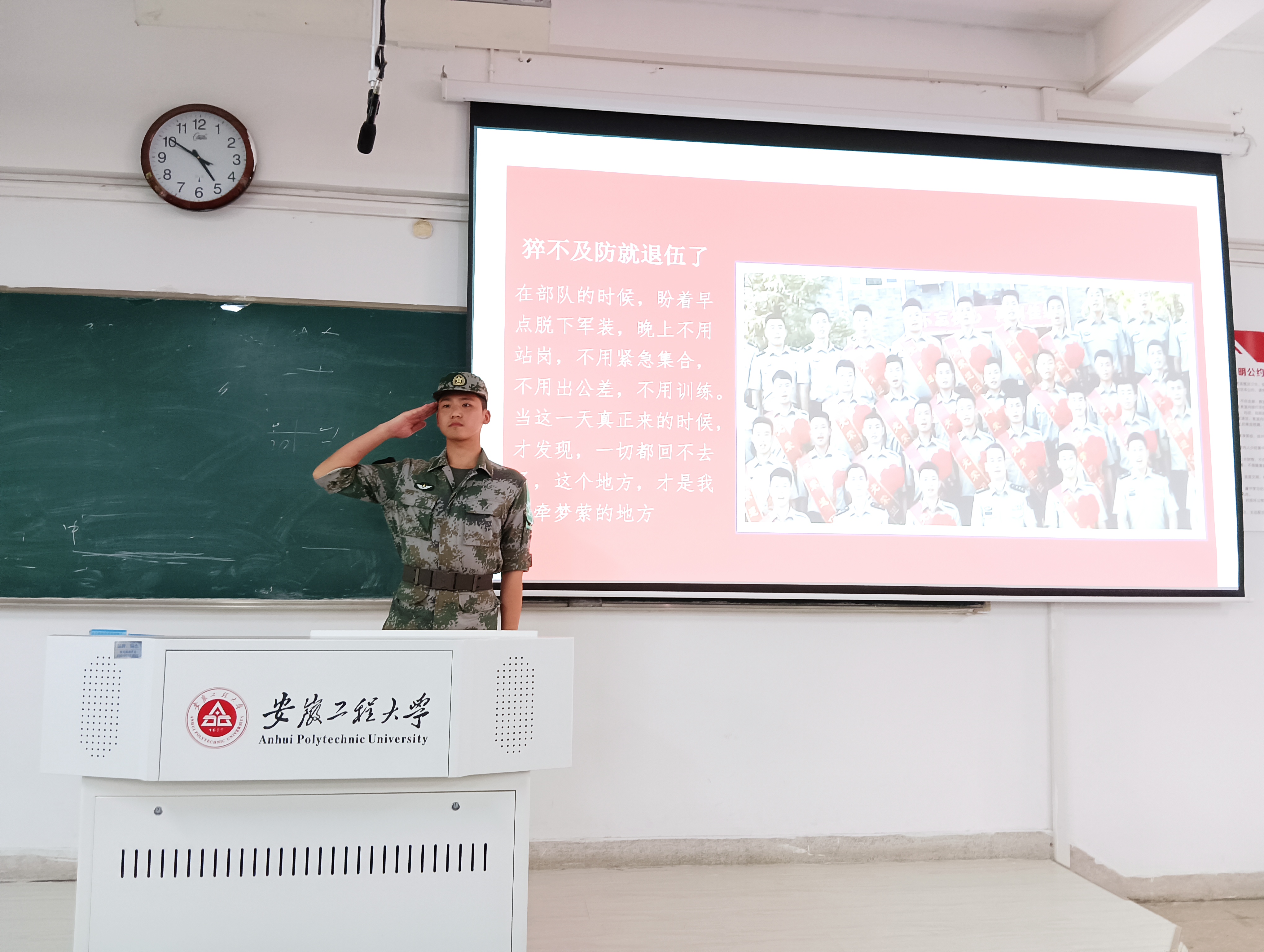 王九香和董云翔两位退伍大学生从自身经历出发,分享了由学生成长为优秀士兵的心路历程,从追逐梦想、军营生活、奋斗青春等方面,讲述了自己在部队的点滴故事,应征入伍不仅锻炼了坚强的意志,炼就了强健的体魄,更使他们懂得了感恩父母、感恩学校、感恩国家,并鼓励大家让青春在部队闪光、让梦想在军营绽放。