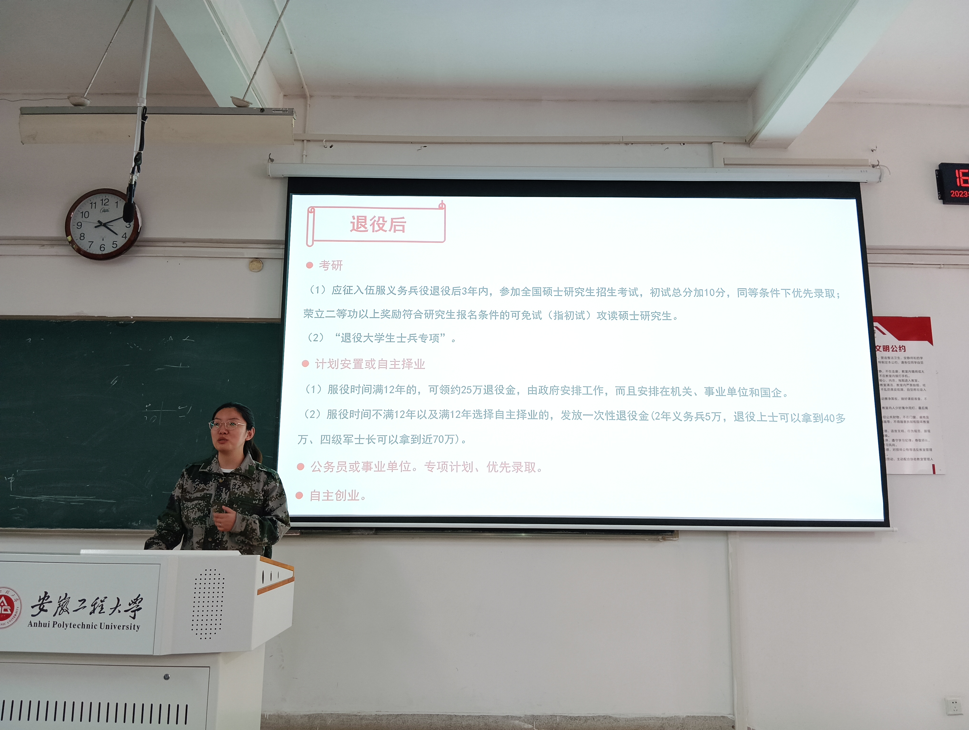赵成婧老师以国防的重要性为切入点,从优待政策、入伍条件、应征流程以及常见问题四个方面详细解读了大学生应征入伍的政策法规。同时强调征召大学生参军入伍是党中央、国务院、中央军委作出的重大战略决策,对改善兵员素质、提高部队战斗力、促进青年学生的成长成才具有重要意义。