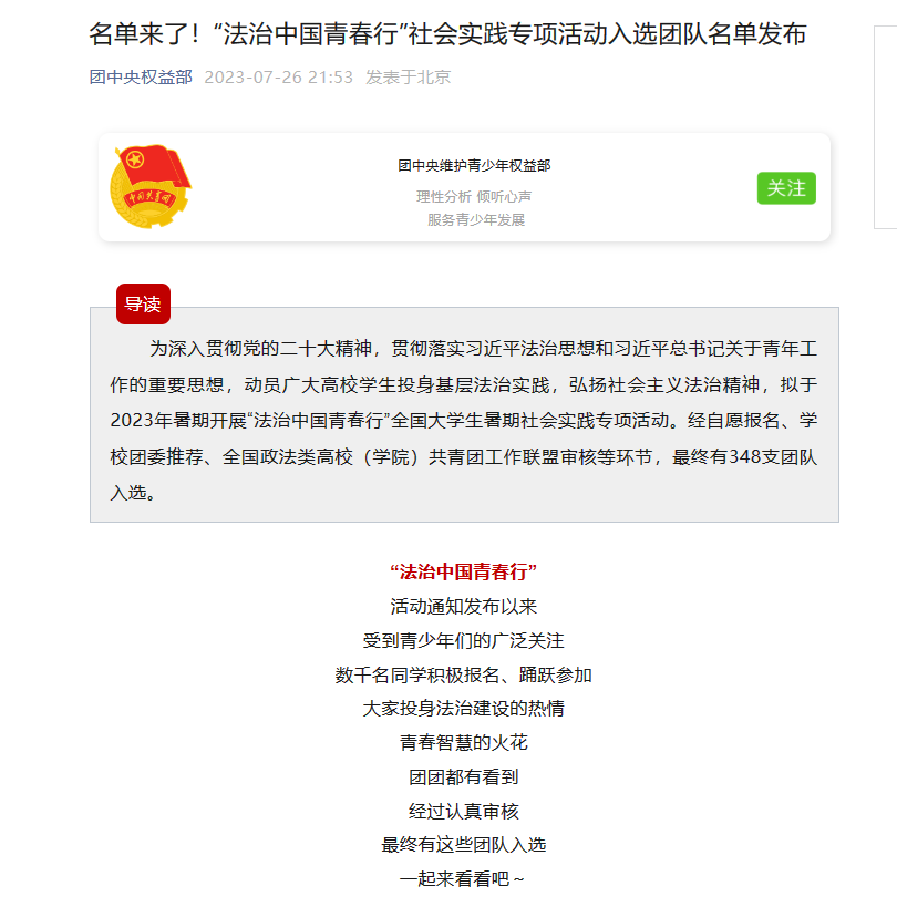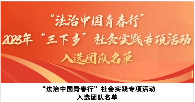 近日,团中央维护青少年权益部发布2023年“法治中国青春行”社会实践专项活动团队入选名单,由我校人文学院法学专业本科生为主组织成立的5支暑期法治实践团队经过团队申报、团队遴选、实践材料展示等环节,成功入围。