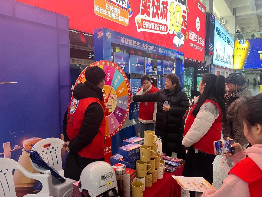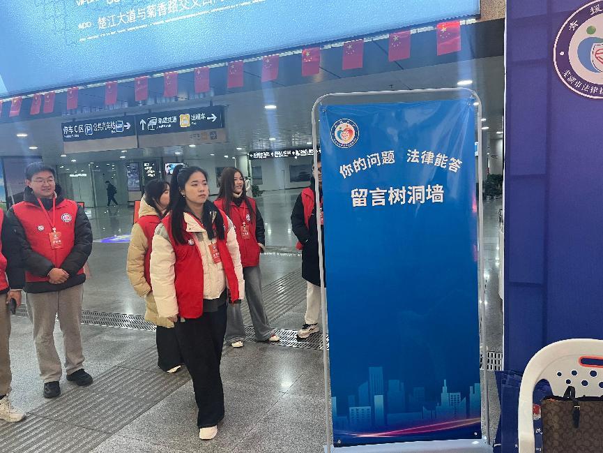 活动现场设置了普法展板,以转盘抽题、翻翻乐形式展示维权案例及法律条文,增强普法宣传的互动性和趣味性。考虑到火车站人群赶车时间较紧的情况,对于来不及现场咨询的,在翻翻乐展板旁边设置展板“你的问题,法律能答”的留言树洞墙,农民工可匿名写下问题(提供便签纸)和联系方式,后续安排相关老师一对一电话解答。同时,充分利用芜湖站内小型电子宣传屏播放法治宣传片,以扩大普法宣传的效果。