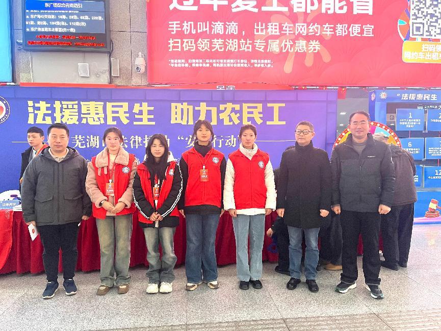 为深入贯彻落实党的二十大和二十届二中、三中全会精神,落实习近平总书记考察安徽重要讲话精神,落实省委十一届九次全会和全省“新春第一会”精神,2月21日下午,人文学院法学系教师党支部、法学系普法宣传功能型党支部、校法律协会师生一行在芜湖市火车站东广场,与芜湖市司法局法律援助中心党支部、中共镜湖区委政法委员会联合开展“法援惠民生 关爱农民工”普法宣传主题党日活动。