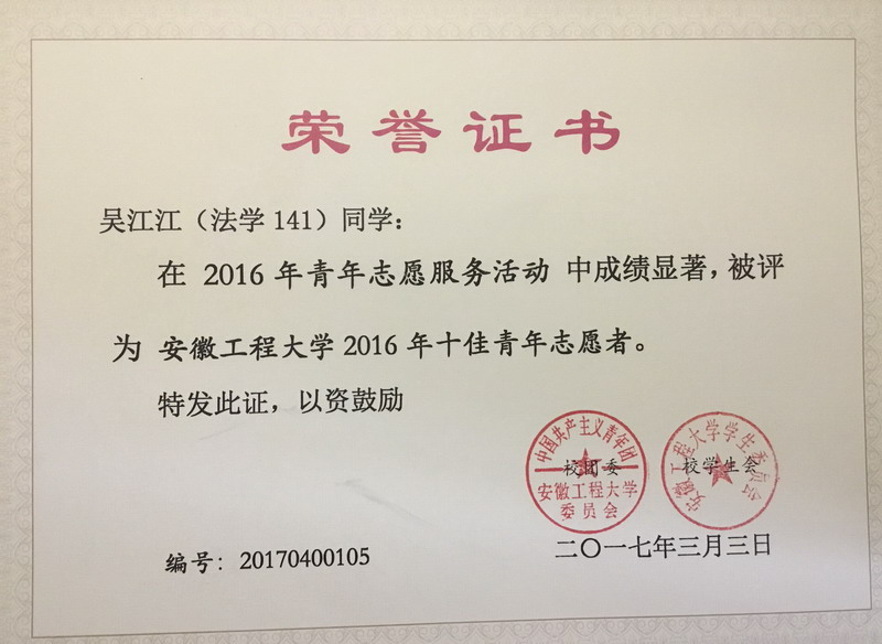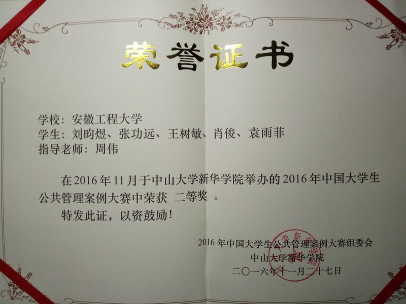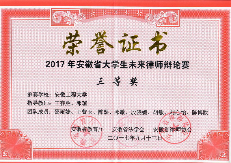 2017年获安徽省大学生未来律师辩论赛三等奖