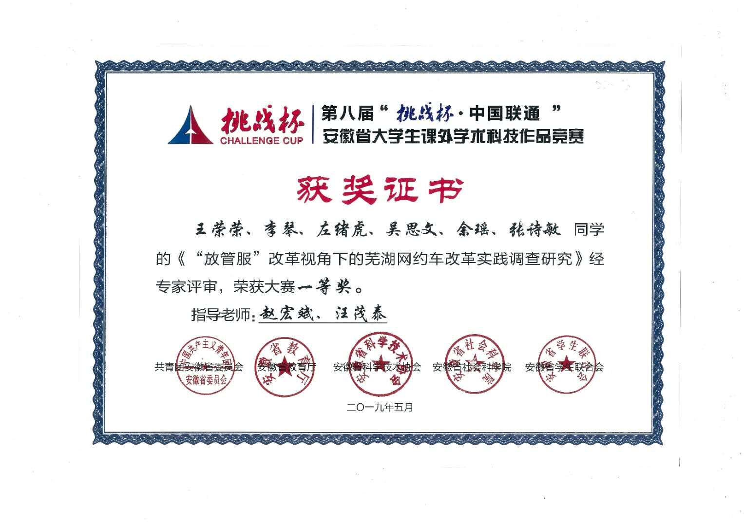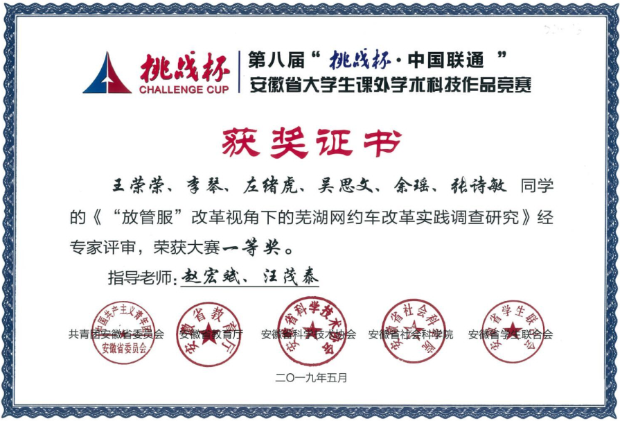 第八届“挑战杯·中国联通”安徽省大学生课外学术科技水平竞赛一等奖