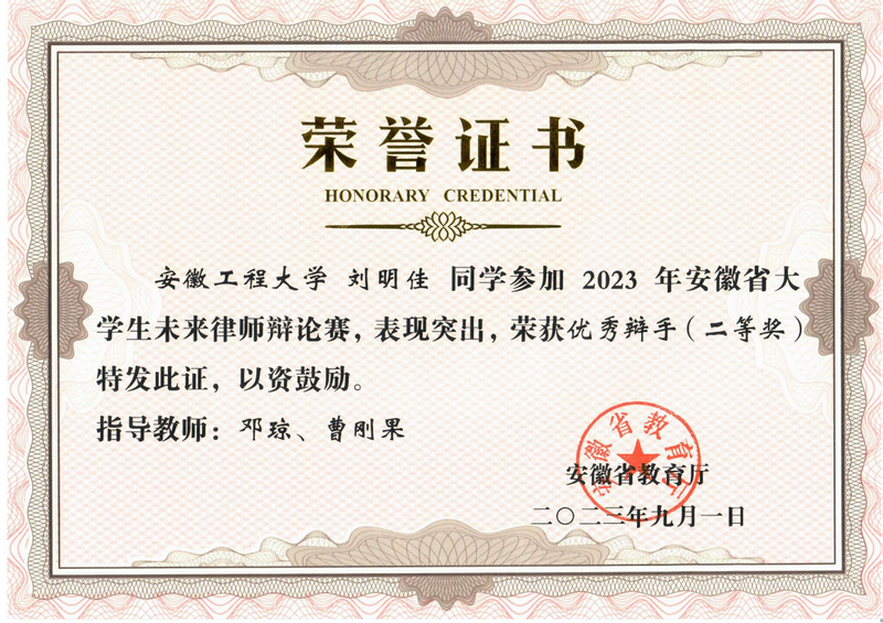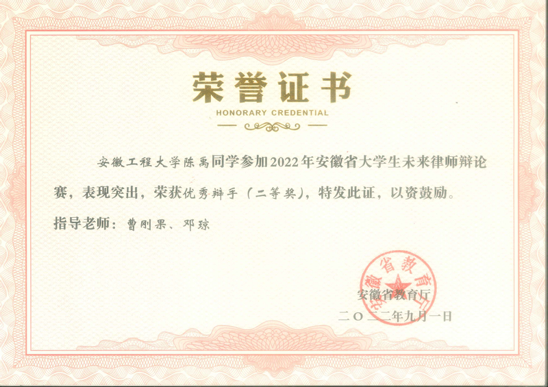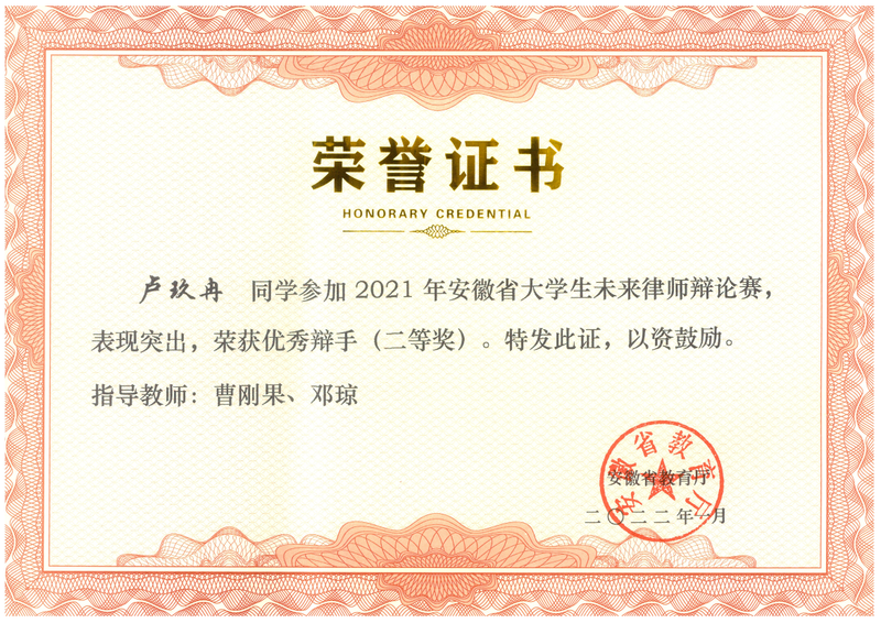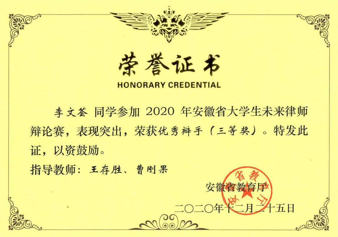 安徽省大学生未来律师辩论赛优秀辩手(三等奖)