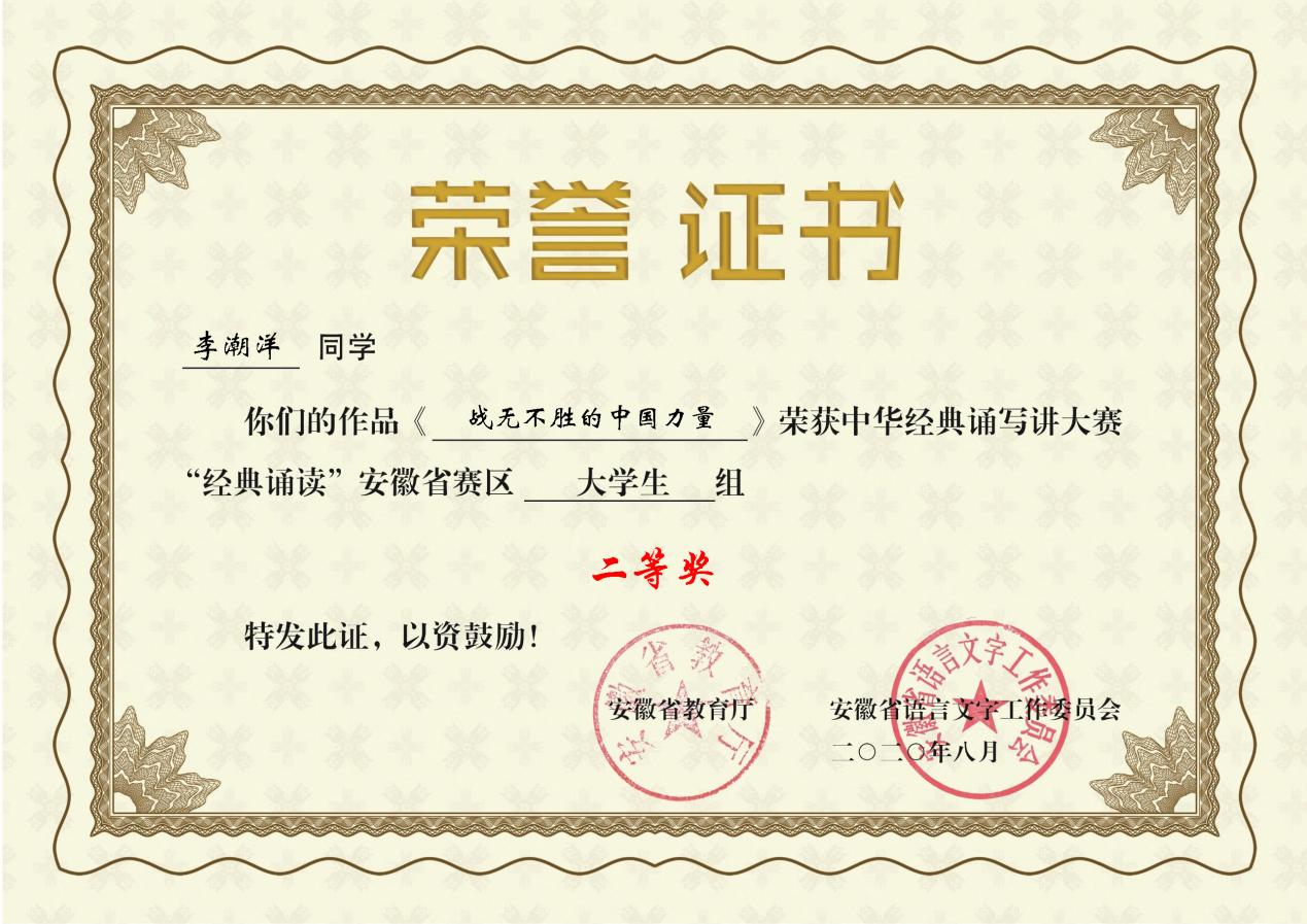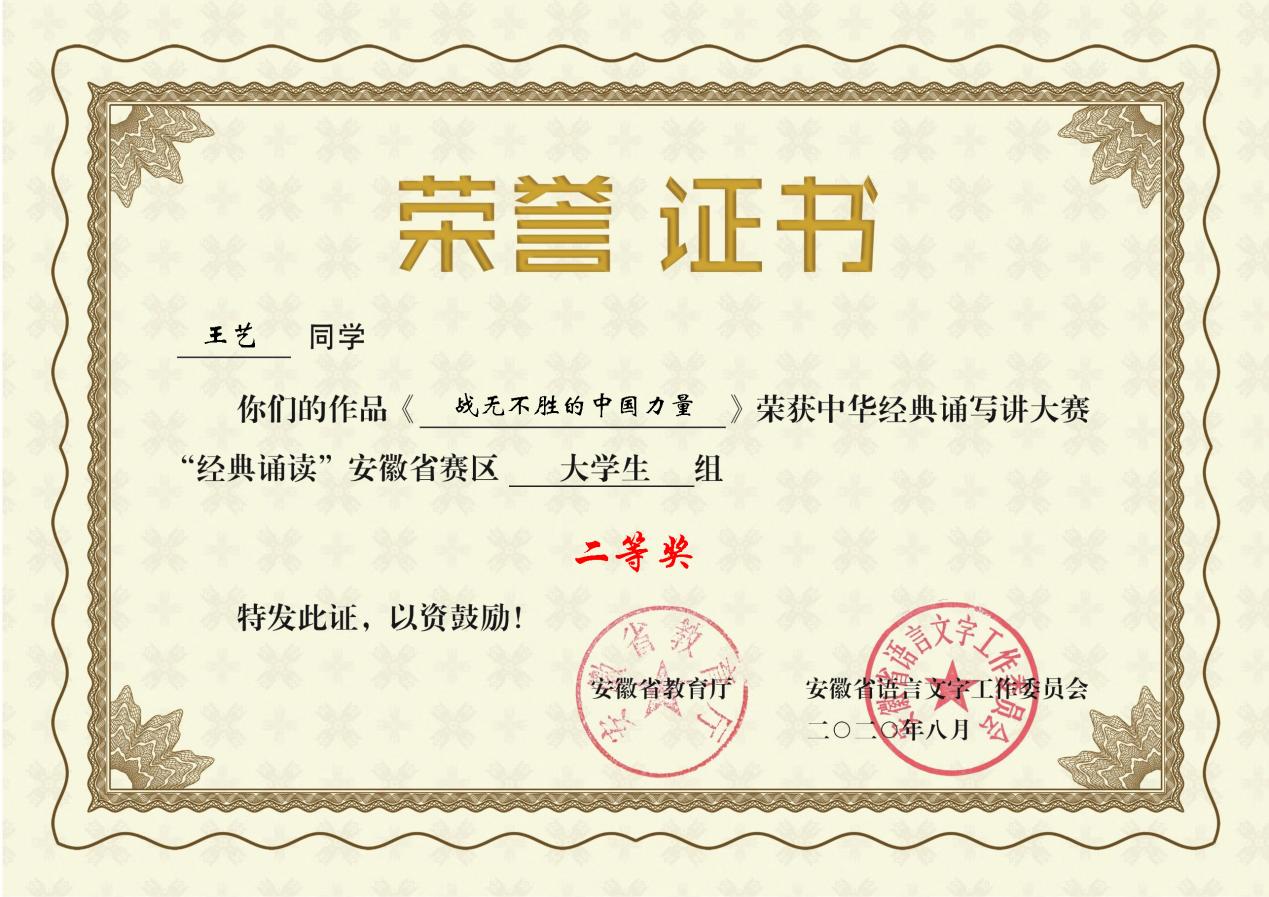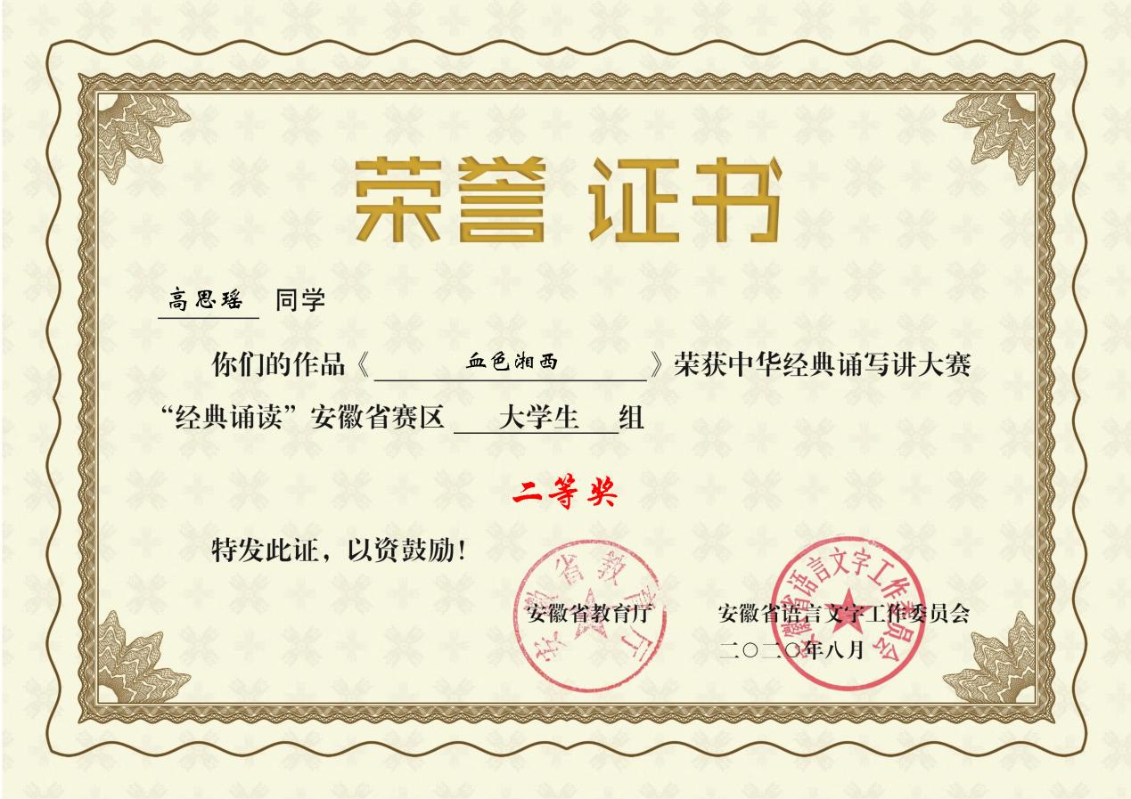 中华经典诵写讲大赛“经典诵读”安徽省赛区大学生组二等奖