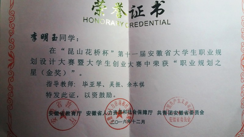 2016年李明玉获安徽省大学生职业生涯规划大赛金奖