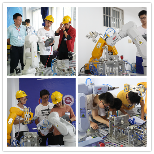 正式比赛为一天半的时间,参赛选手们按照抽签顺序依次入场参加比赛。比赛内容为双机器人协同作业完成滚动轴承的自动装配,每队由2-3名选手组成,要求选手在规定时间内完成PLC与两台机器人间通讯建立、I/O口分配、电气连接,PLC和机器人程序编写与调试以及机器人动作示教工作,重点考察选手组建机器人协同作业系统的综合能力,以及机械、电气、气动和控制的综合装配和调试技能。