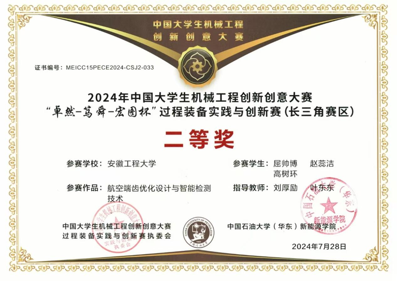 近日,2024年第十五届中国大学生机械工程创新创意大赛“卓然-笃舜-宏图杯”过程装备实践与创新赛总决赛在中国石油大学(华东)落下帷幕。我校人工智能学院丁河安、屈帅博等同学组成的两支参赛队伍分别荣获国赛二等奖1项,长三角赛区二等奖1项的好成绩。
