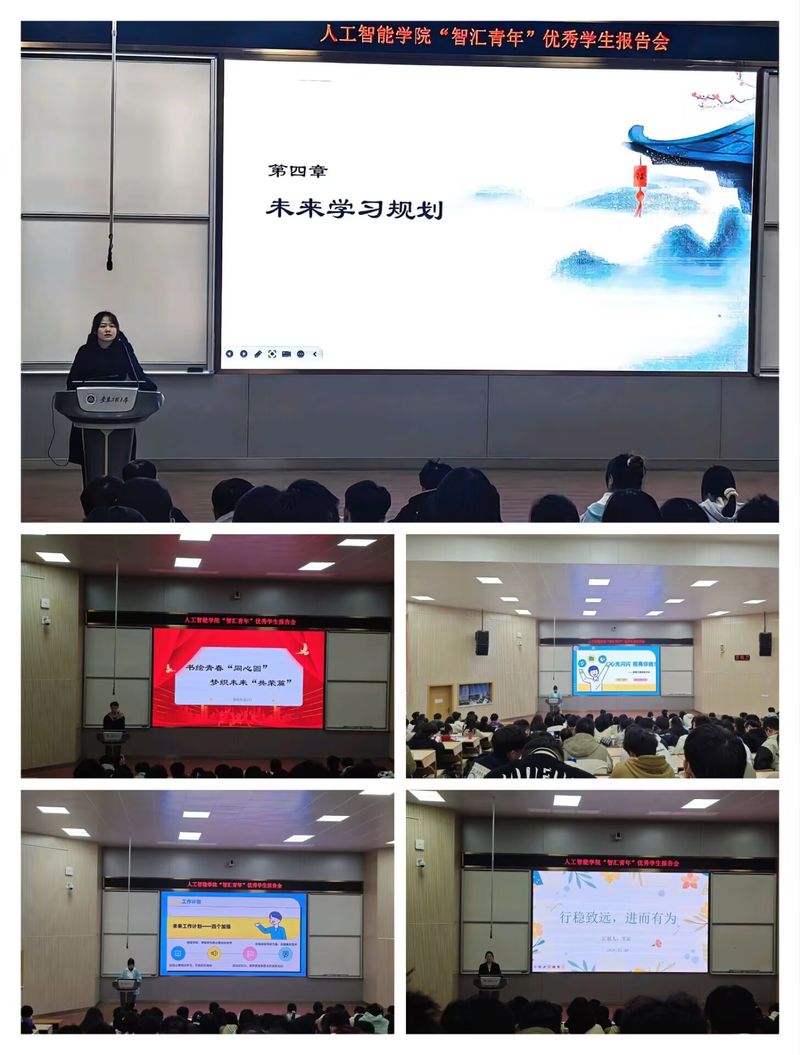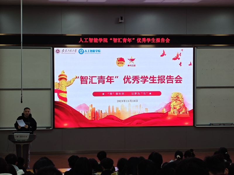 为落实“三全六专”育人实践,弘扬榜样的力量,激励广大学生向榜样学习,促进优良学风建设,努力营造良好的校园学习氛围和育人环境,11月18日晚,人工智能学院在校本部2J报告厅组织开展“智汇青年”优秀学生报告会,2024级学生、青马班全体学员现场聆听报告会。