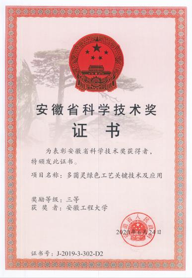 近日,我院化学工程系霍朝飞、刘欢和张荣莉等老师收到了安徽省科技厅下发的安徽省科学技术奖三等奖荣誉证书(多菌灵绿色工艺关键技术及应用),是化学工程系继2018年唐定兴老师(无微漏医用输液袋制造关键技术与应用,安徽省科学技术奖二等奖)和2019年杨仁春等老师(碳四改质过程节能减排与安全存储关键技术及装备,安徽省科学技术奖二等奖)之后连续第三年荣获安徽省科学技术奖。