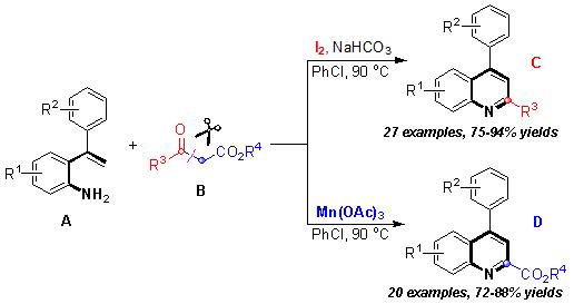 我校化学与环境工程学院张泽教授及徐绘博士带领的研究团队近几年主要从事杂环化合物的有机合成方法学研究,针对上述喹啉类化合物合成中的困难问题,经过前期艰苦探索与攻关,近期在高选择性合成不同类型多取代喹啉方面取得重要研究进展。该项工作的核心是:以常规的2-苯乙烯基苯胺(A)与β-酮酯(B)为起始原料,巧妙利用安全且价廉的I2与Mn(OAc)3来调控原料分子中C-C键的断裂与形成方式,进而实现对其环化反应选择性的调控,分别高效合成出27种2-烃基喹啉化合物(C)及20种2-酯基喹啉化合物(D),并基于系统的控制性实验及中间体的检测结果与证据给出了这两条反应路径的形成机理。